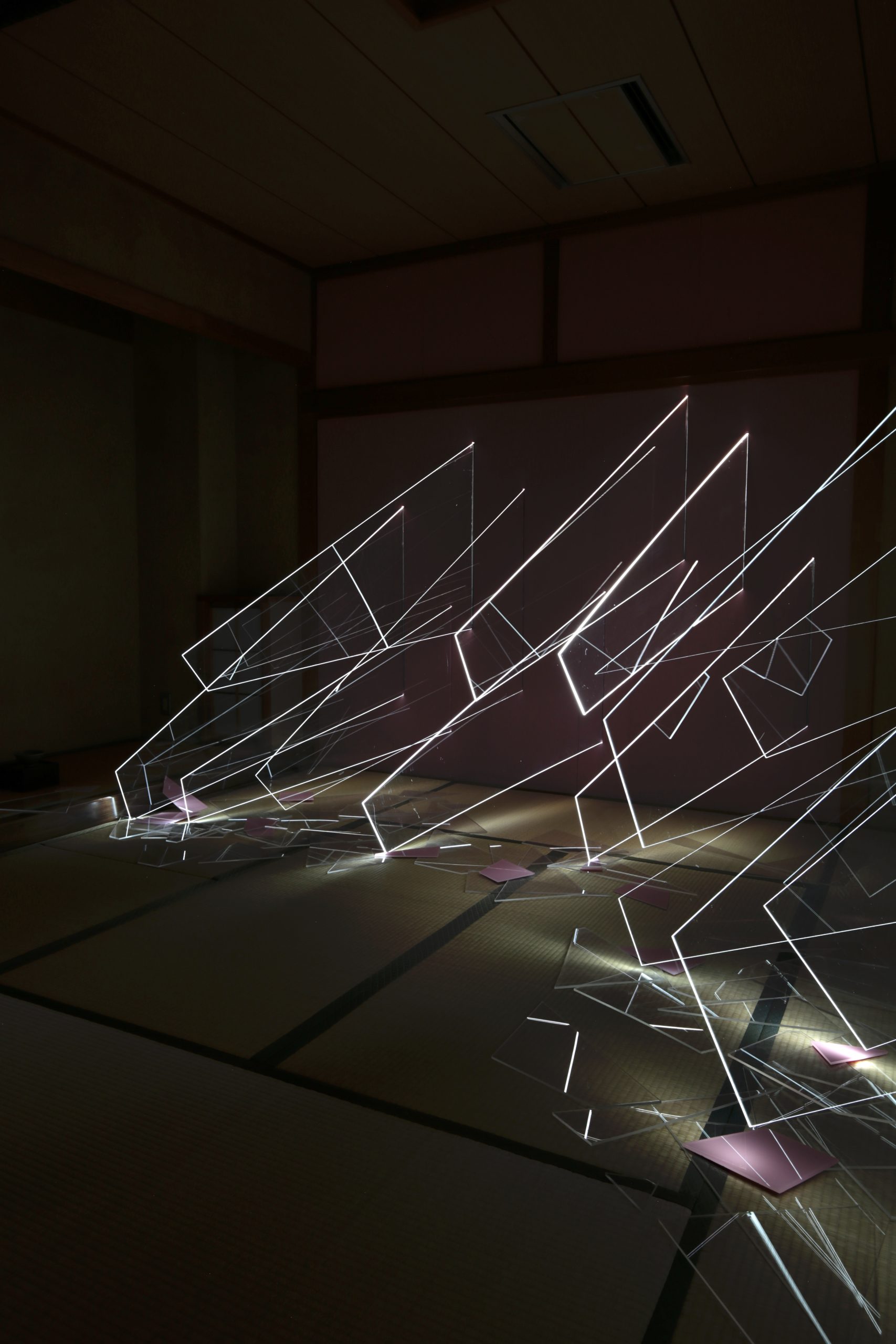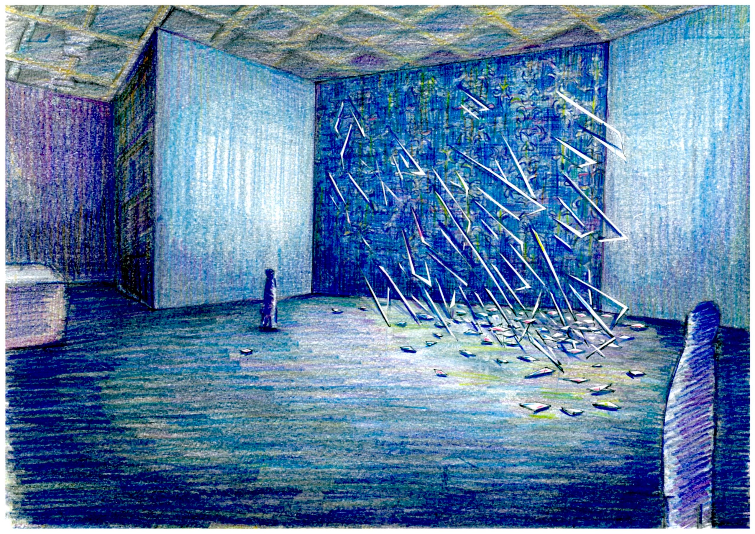 階下に下り大展示室に入ると、小展示室との間は巨大な壁でふさがれ、壁紙が施されている。無数の透明のアクリル板が壁を貫通してこちら側に侵入し、向こう側の照明を透過して発光する。床には同じようなアクリルの破片が散乱し、光を反射する。また大展示室に設置されたセンサーが鑑賞者に反応すると、小展示室の扉に明かりが灯る仕掛けとなっている。