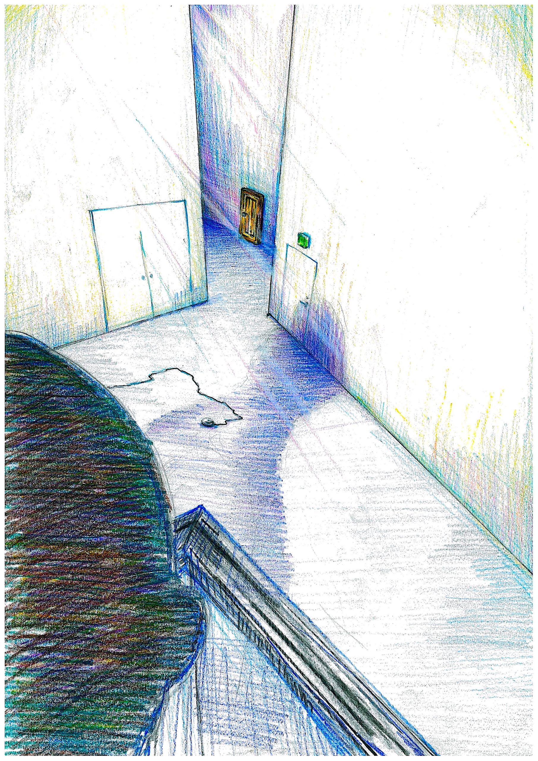 まず鑑賞者は、地下へ向かう階段の踊り場で、玄関にあるような呼び鈴が取り付けられていることに気づくだろう。呼び鈴を押すと、階下の小展示室の中央に置かれた防災ベルがけたたましく鳴りはじめる。見下ろすとそこには防災ベルと自身の影のほかは何もない小部屋だ。奥に建てられた壁には扉がひとつ設置されていて、時折扉の上で明かりが灯る。初めて資生堂ギャラリーを訪れ、展示室全体の構造を知らない人が見たら、なおさら閉塞感のある不穏な光景に映るだろう。