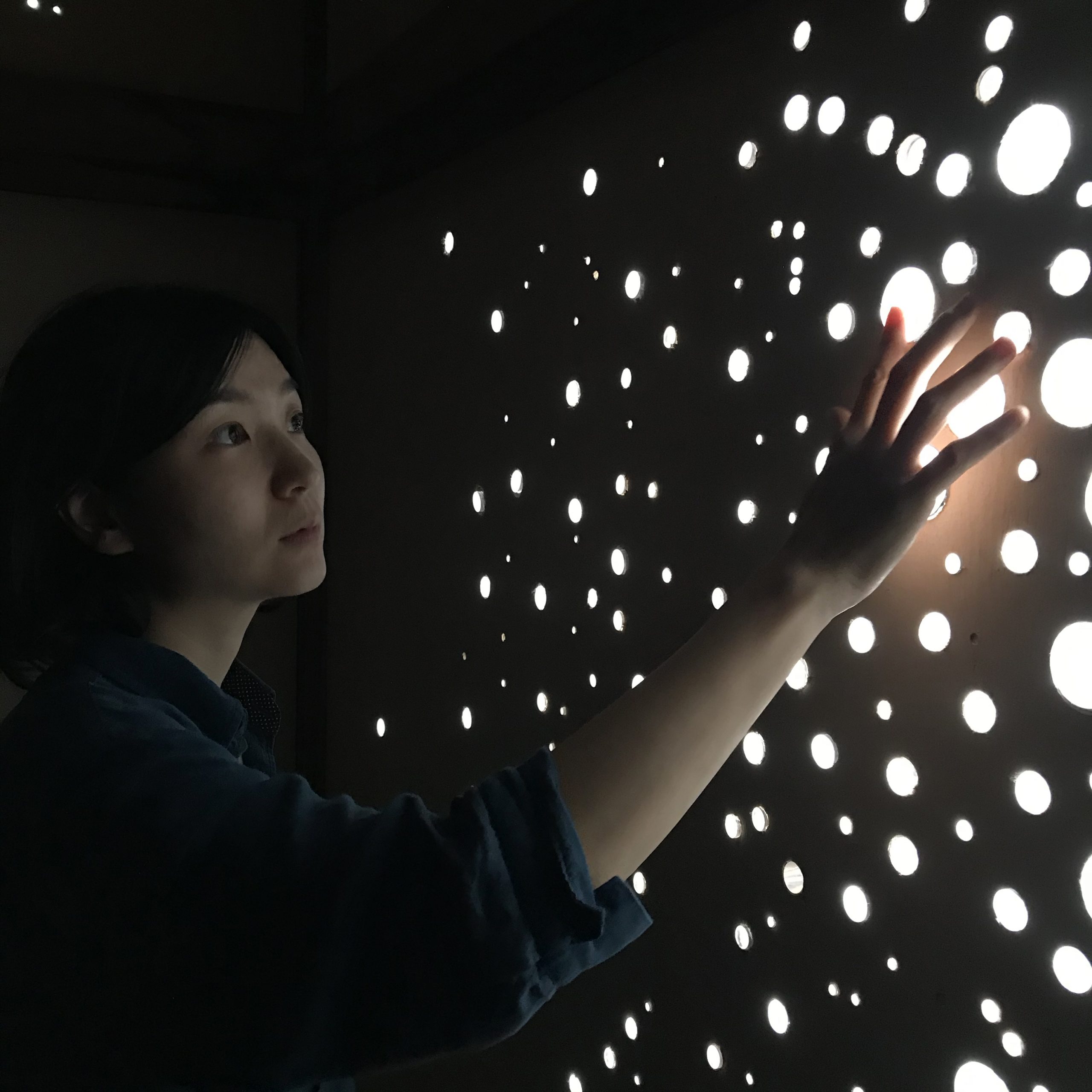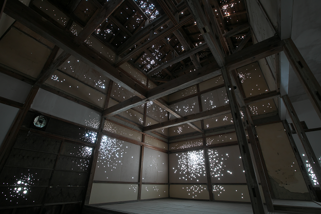 本年秋に開催された奥能登国際芸術祭では、珪藻土工場の事務所だった小さな空き家の壁や屋根に無数の穴が開けられ、そのひとつひとつに円筒形のアクリル樹脂が挿し込まれたインスタレーション『あかるい家 Bright house』を発表した。日中は仄暗い室内に太陽光が射し込み、人工の星空に覆われたかのようになる。夜間は室内の人工照明の光が穴から漏れ出て、夜空に向かって発光する。