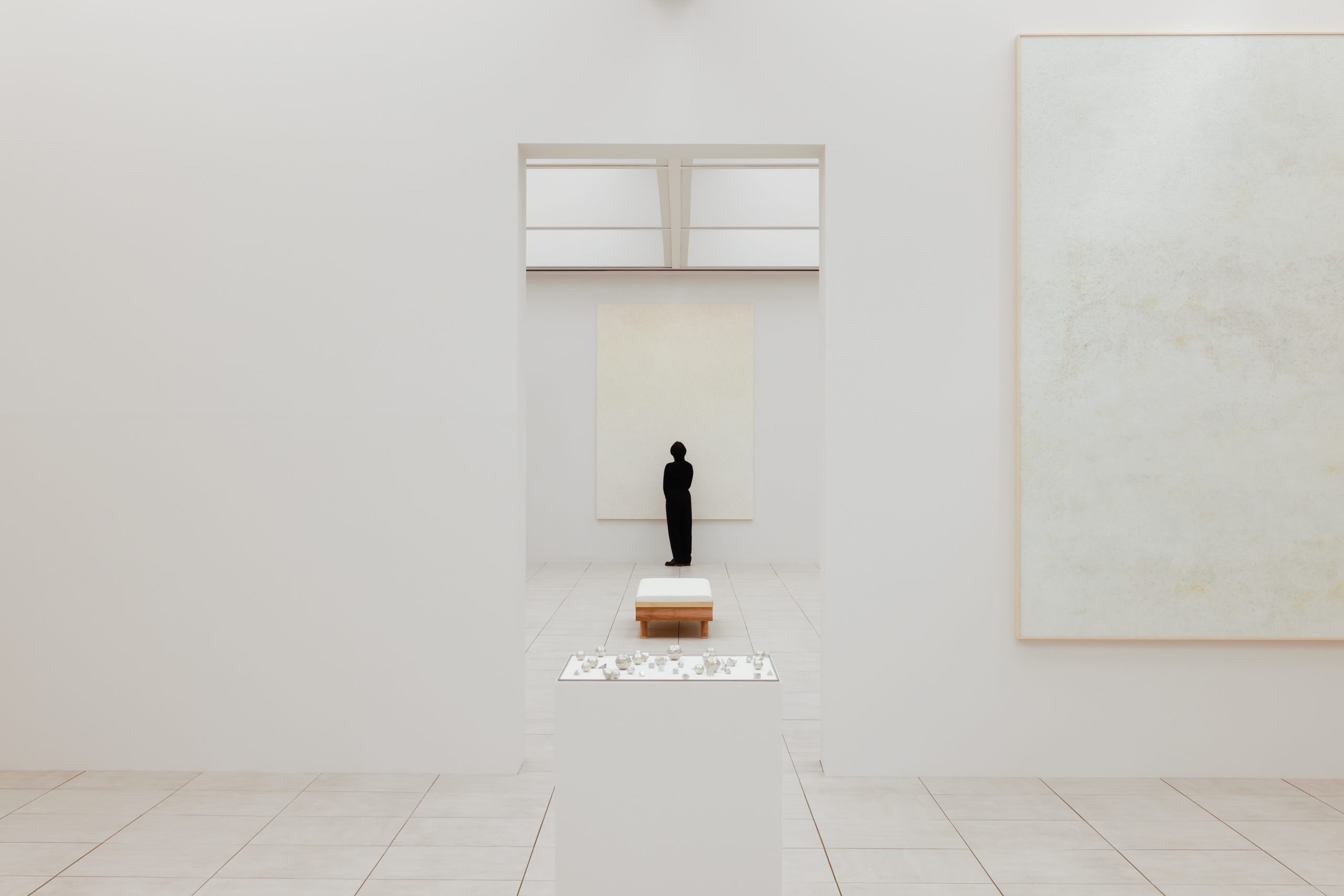 「今回、作品の内側に、多視点性、多角性が含まれていると思います。それと最近、『人は、視線を遠くにやる、もしくは焦点が定まらないとき、脳は想像という運動をはじめる』ということを見つけて――焦点が合わないときの目の運動は、『想像する』という脳の運動を促しているのではないかと……これは一つの発見でした。僕は自分の作品を見ているときにそのことに気づいたのですが、たとえば、水平線や空の向こう、森の影など、見ようとしても見えないときに、なにが来るかわからないので、想像をするという頭が働く。抽象的という状況は、実はそういう仕組みだったのかもしれない。古来から。今回の展示の構成ではそういったことも理論的に実験しようとしています。例えば、最初の〈ホワイトペインティング〉シリーズでは、目では焦点は合わせられない。水と鏡の《海庭》では視線が遠くへいきやすい。〈レインボーペインティング〉シリーズも、普段から歩を緩めて物事を『よく見ようとしている』場合と、そうでない場合で、見え方が変わる作品だと思います。それで彫刻作品の《想像 #1 man》は、焦点はなくなり、多数を越えてほぼ無限のイメージが存在できる。そのような構成を考えています。もちろん、先程お話したように、僕がいくら話をしても、作品や空間は、ことばはもちろん想像を超えることがあるのですが。