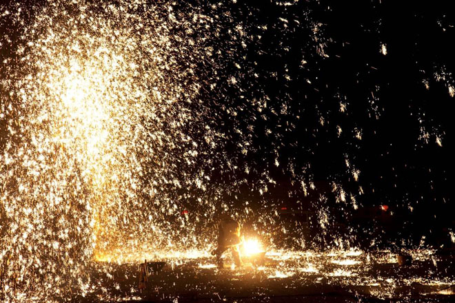 川内さんのことばに表される感覚は写真作品と同時に作成された動画作品によって、より鮮明に実感することができる。前述の溶けた鉄くずの火花とは、中国、河北省で開催されるお祭り「灯樹花」でのふるまいのことで、そこの土地では花火の代わりとしてそのような行いがなされるのだという。液体化した鉄くずが瞬時に固体となり弾け跳ぶさまは鮮烈で、野趣に富んでいる。それらの火花や椋(むく)鳥の群れ、神事の光景などが途切れることなく続いて映し出されるストーリーによって、見る側は自然と、宇宙の中に立つ自分の中へ意識が立ち戻っていくことを感じるはずだ。