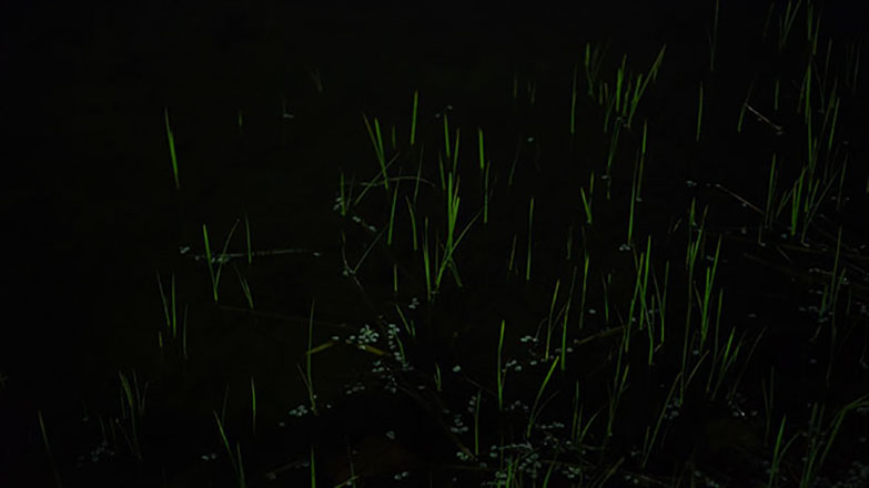 星は、青く深い夜空を飾り、風に吹かれて宙を降り、木々の上を漂って、波の揺らめく海に落ちる。そんな、ただ美しい光景を前に、哲学者ならその意味を思い、科学者なら理由を探すが、音楽家は星図を音符に象り、詩人はひと言「美しい」と零すだろう。美術家・ミヤギフトシの映像作品《How Many Nights》には、音楽と詩が映されている。
