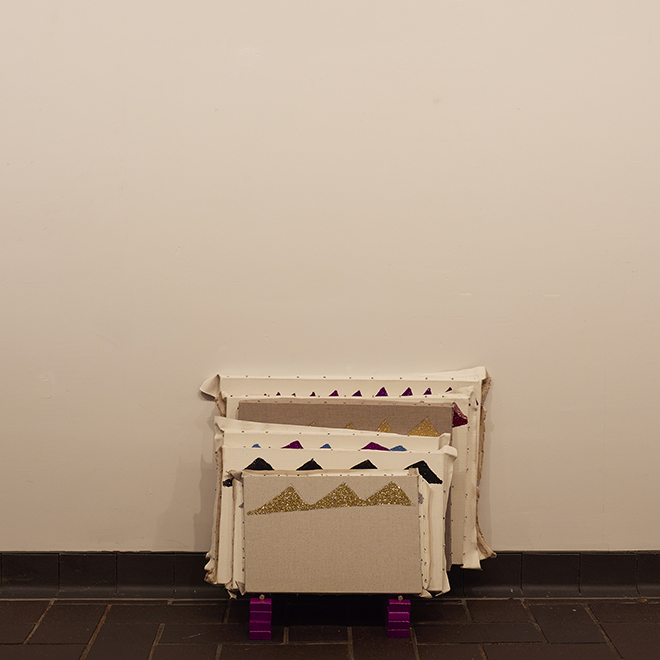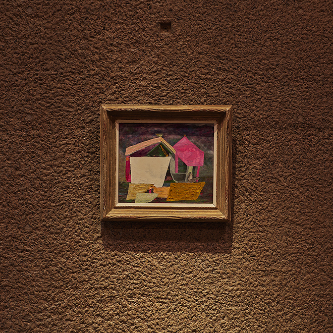 例えば「とんぼ」と名づけられたギャラリーBという部屋に展示された一枚の絵。年季の入った漆喰のような質感の白い地に、うっすらとした黒い線でかすかにドローイングが施されている。小屋の形のようだ。それだけでもなぜか惹きつけられてしまうのに、キャンバスの右端、2センチくらいの幅の縦の空間に、ピンク色のスタイロフォームがはめ込まれていることに目が気づくと、途端に絵の表情が変貌してしまう。色彩と、線と、形と、濃淡と、強弱と、位置の、リズム。たったひとつの工夫が、波紋のように絵の全体に広がって、絵をなしているいくつもの要素を、繊細に、ざわざわと、激しく、動かしていく。そして見渡すと、ひとつの絵が、隣り合った作品や、会場全体の空気とつながっていることが感じられる。そのことに気づいてしまうと、もう、それ以外の存在の仕方が考えられなくなる。完成してしまっているのだ。そして、この展示の作品には人の姿が現れないのに、ひとつの絵が、会場のすべてが、まるで生きているような気配がしてくる。