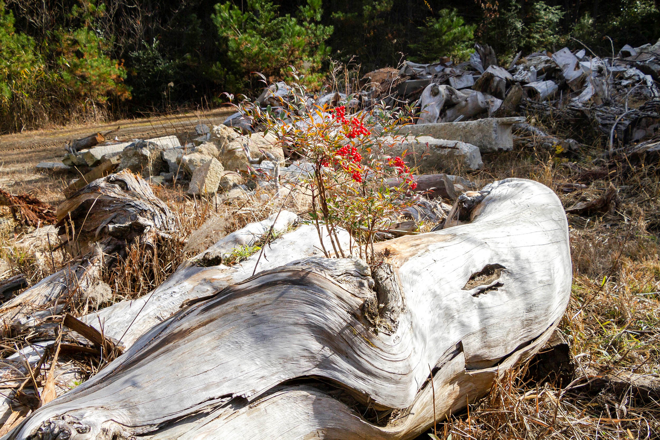 「2020年、それまで拠点にしていたロンドンから帰国したところで、この御神木についてリサーチすることに運命的な繋がりを感じました。自分はよそ者なので、まずは土地の方々の許可を得ることが必要でした。あるとき現場に行くと、倒れた御神木の上に立っている人がいます。その方は地域に住む彫刻家で、私のリサーチについて神社の境内で説明を聞いてくれました。それを機に、地域のさまざまな方々と出会いました。