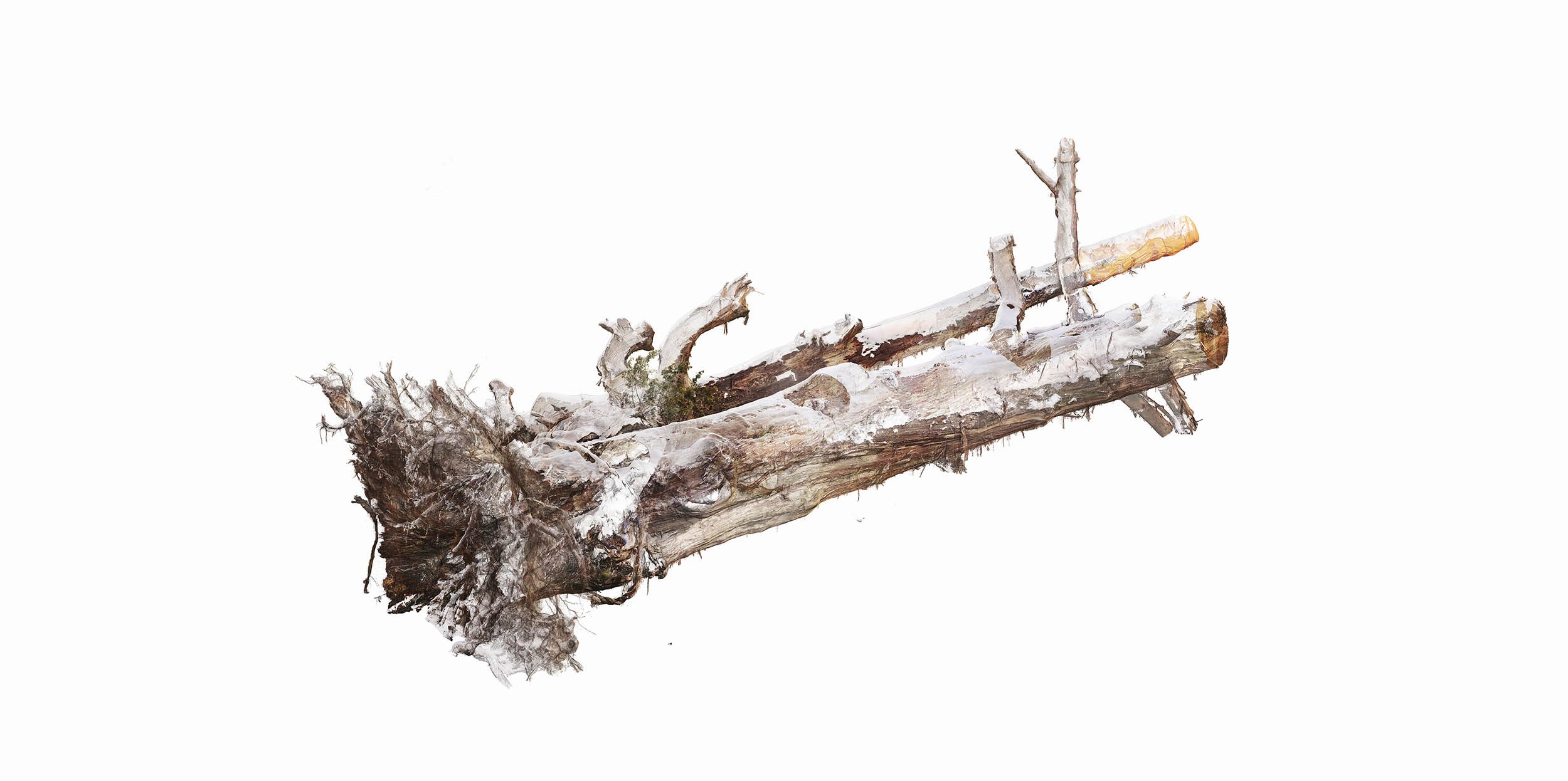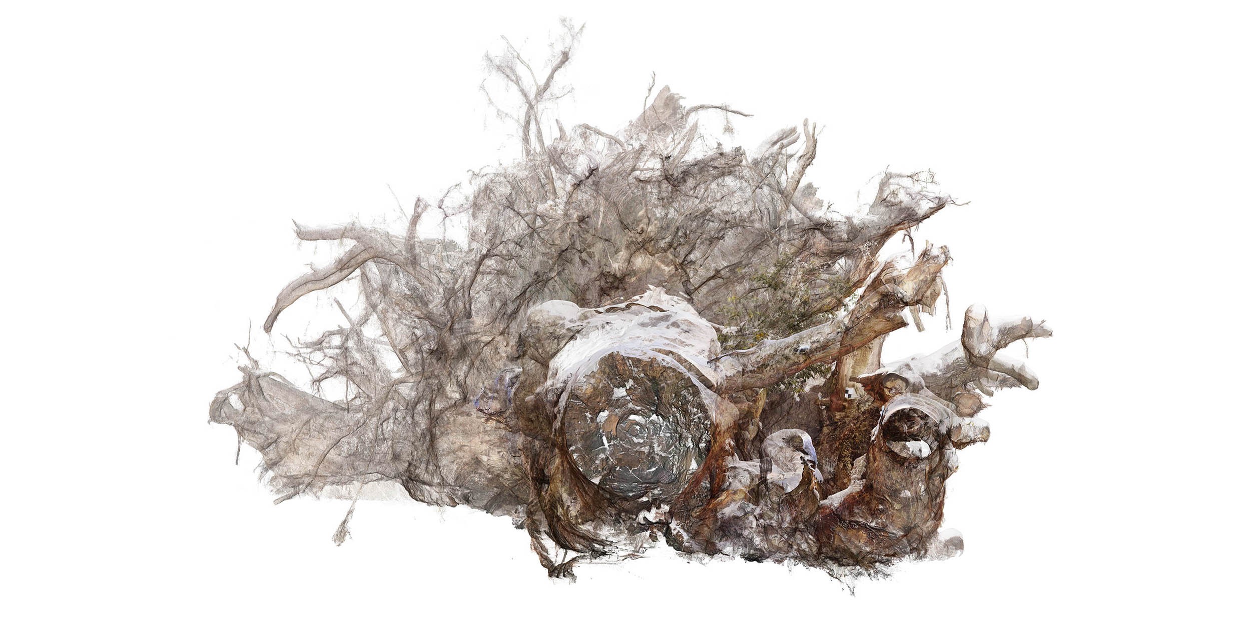 なかでも、当時の倒木現場の状況をデジタルアーカイブ化するため、3Dスキャンした数値データから生成した立体 作品は、佐藤の創作活動の主幹となる。物体の表面にレーザー光線を照射して対象を捉える3Dスキャンによって、倒木を点座標として詳細に記録することで、土地の風土や伝承、集合的な記憶や原風景を、デジタルデータという新たな形でとどめようとしたものだ。
