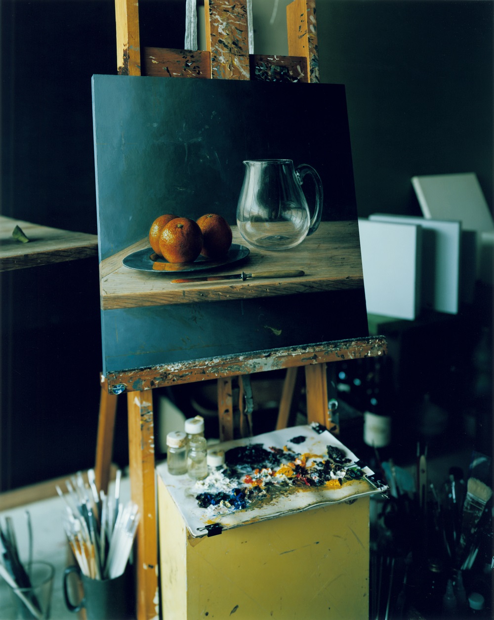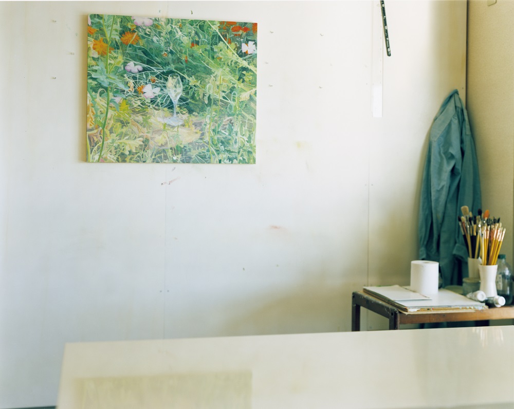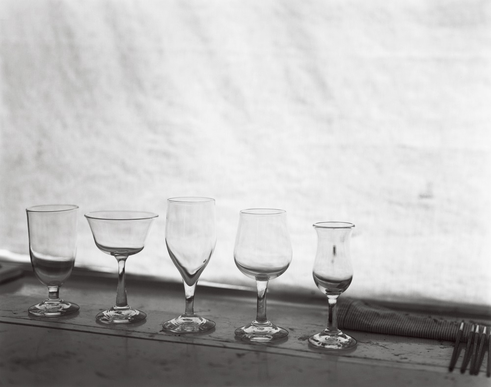 ガラスという素材を媒介に、山野氏とさまざまな文化的背景をもつ画家たちが、ことばとイメージを通じた対話を経て作品制作を行いました。9月に刊行された作品集『Glass Tableware in Still Life』では、山野氏によるガラス器と画家たちが描いた静物画を、三部氏が画家のアトリエで撮り下ろした写真で構成。透明なガラス器と静物画を、8×10の大判カメラでそれぞれの画家のアトリエで撮影され(ガラス器は白黒フィルム、静物画はカラーフィルム)、35mmカメラでは画家のアトリエの風景を白黒フィルムで写真に収められています。