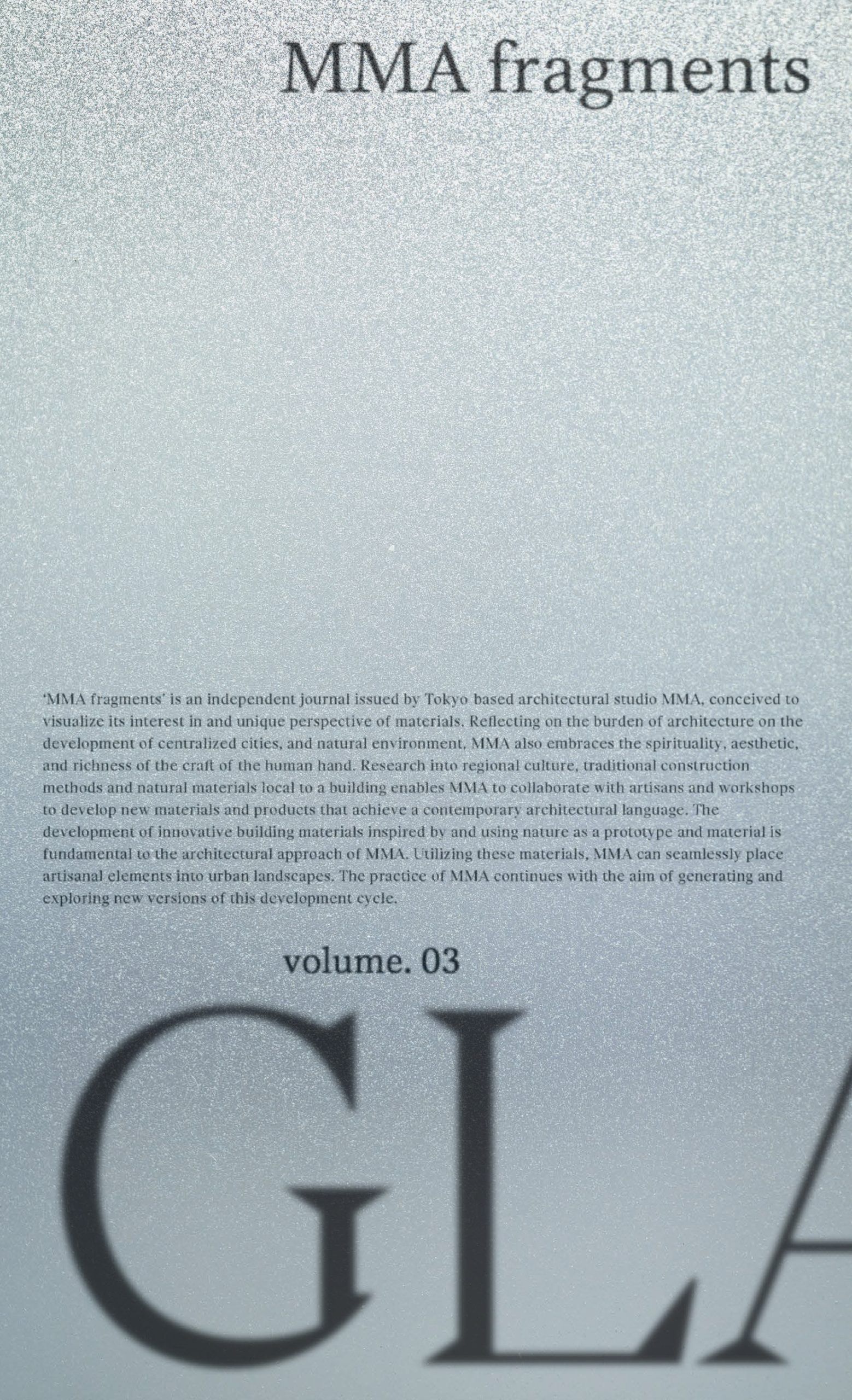このジャーナルは、MMA Inc.が一貫して持ち続けてきた、自然から着想を得て、新たな建築素材を発想し、そのエレメントを都市の中に配置するというアプローチを、書物という半永久的に時を超えていくメディアを通じて表現したものです。第3号の『03: GLASS』では、ガラスを用いた建築やアートなどのさまざまなアプローチを取り上げ、素材自身が持つ可能性を探求しています。