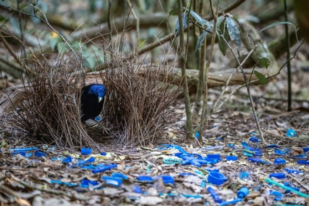 今、私がこの原稿を書いている机の上は無秩序に散らかっている。飲みかけのエナジードリンクの缶、出張に行ったときに買った銘菓の菓子袋、郵便受けに入っていたチラシなど、とても何かの作業ができるような環境でないように思う。しかし、人それぞれ、作業がしやすい環境や落ち着ける環境は異なる。その前提のもとお伝えしておくが、私にとって今の机の散乱状態は、作業がしやすかったり、落ち着けたりする環境では決してない。もともと机の上には何もなかったのである。それが日々の生活の中で、無意識のうちに、無秩序な空間として構築されていったのである。繁忙期に仕事に追われ飲んだエナジードリンク、その翌日からの出張ついでに買ってきた銘菓の菓子袋、出張中に郵便受けにたんまりと溜まったチラシ。好むと好まざるとに関わらず、生活の中で机の上に構築された、美しさとはほど遠い空間である。そんな空間を私のように無意識に構築していく人間がいる一方で、地球上には、種の生存をかけて生活し、独自の美的センスに基づきモノを集め、美しい空間を造る鳥がいる。それがニワシドリ (図1) である。
