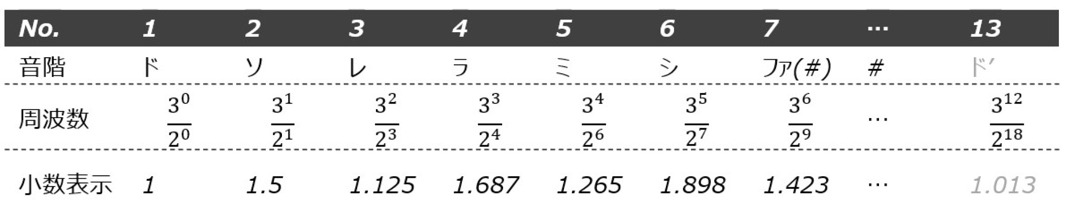 3/2倍音と心地よく響く音を作るためにさらに3/2倍する、というふうに、オクターブずらす(1/2倍する)、3/2倍するという操作を繰り返していくと、13回目にほぼ最初の音に戻る(表1)。したがって12回の繰り返しで打ち止める(3)これが、音階が12音となっているルーツであった。