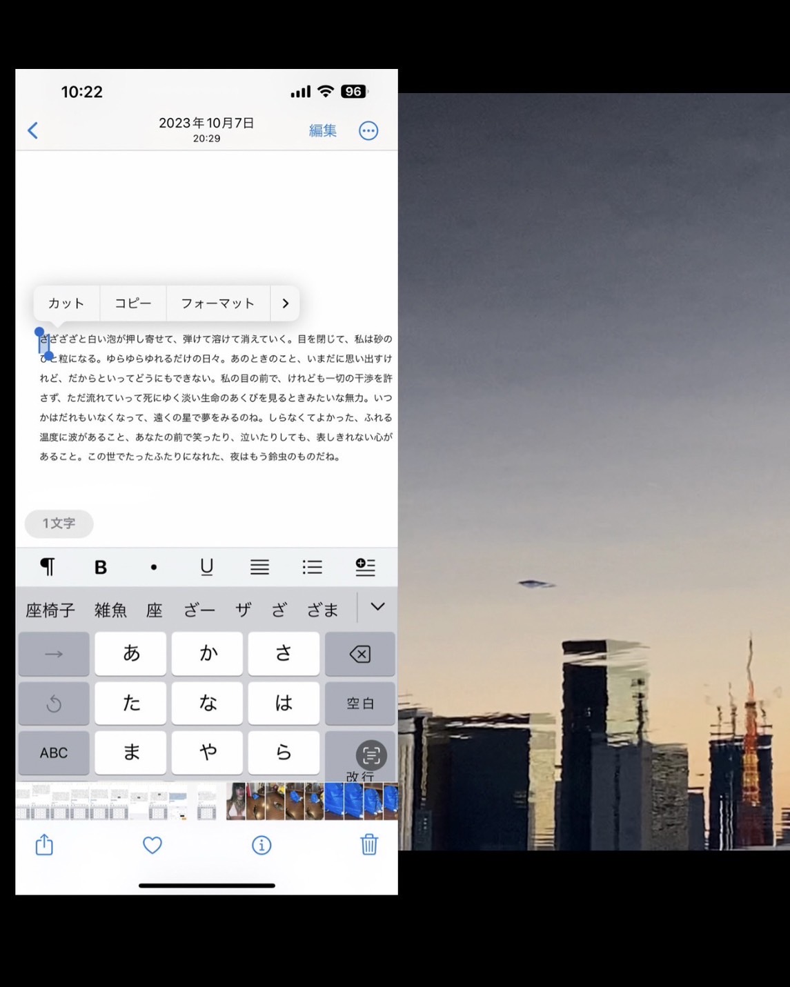 観察し、思考し、未知への好奇心や変化していく自身を、独特のリズムとユニークな語り口で表現してきた内田紅甘。彼女曰く、"現代版の草稿"を意味するスマートフォンでキャプチャされたテキストは、自身の内面を潜ませるかのように、未完として観る者の前に開かれている。切り取られた風景も、鎌倉という夢の中の一場面のように映る。内田が眺める景色と発することば、ふたつの異なる触感の記憶のスクリーンに触れると、鎌倉という場所と読むという行為から、今昔を自由に行き来する彼女の強いまなざしが見えてくる ー小川知子(ライター、内田紅甘「そこにある不在」に寄せて)
