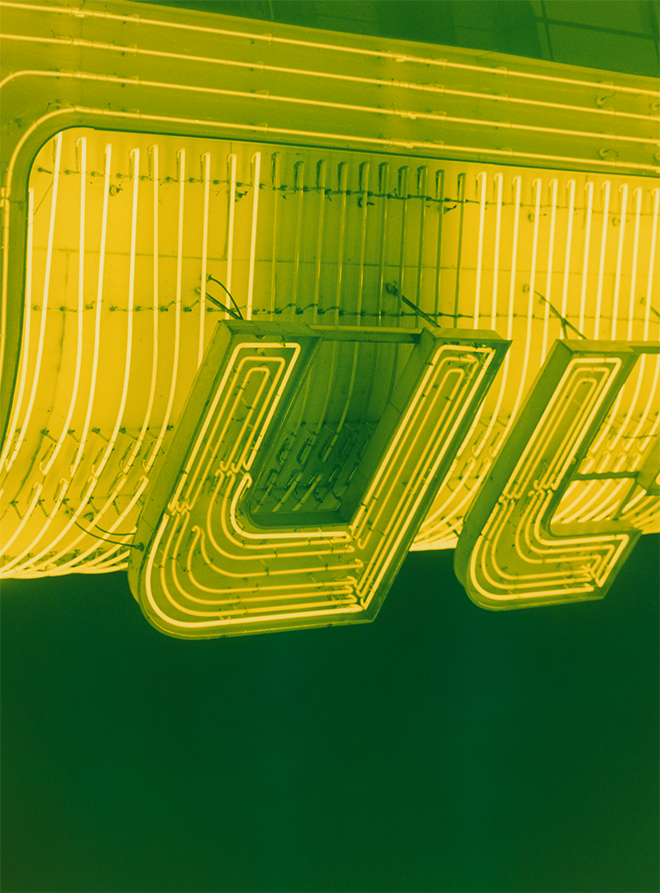 今回、細倉さんが『Jubilee』で発表した、カラーフィルターを用いたシリーズもその“抽象化”を試みたひとつ。アジア都市のネオンサインを切り取った作品群は、それぞれ一色のカラーフィルターによって、トーン・オン・トーンの世界が敷かれ、陰影の濃淡、均一の色味、その中でネオンの部分だけが不思議な浮遊感をともなって発光していて、どこか知らない世界を見るような気持ちにさせる。「ありのままのイメージではなく、カラーフィルターという方法で被写体を一旦現実から引き離す、つまり抽象化することで、現実世界の中に埋もれている“ヒント”を提示するような感覚です」。