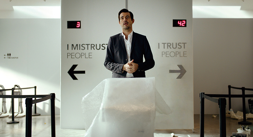 映画『ザ・スクエア 思いやりの聖域』の投げかける問いは、とてもむずかしい。主人公は地位と名誉と容姿に恵まれ、巨額の金が飛び交う現代美術のグラマラスな世界で勇躍する男。だがある日、スリに遭った腹いせに、犯人に脅迫状を送り付けることを思い立つ。一方で、ある作品を据えた自館の展覧会の、宣伝のために制作した動画がネットで炎上する。その作品“ザ・スクエア”とは、4メートル四方に四角く地面を区切っただけのもので、脇にはただ、こう記されている。
