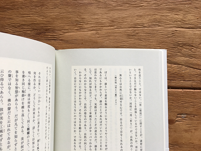 桃山期・江戸期の漆椀、漆器づくりの工程、漆という素材、古物の「写し」、先人たちの死、工藝界と自身の活動の時代的整理、芭蕉の俳句、滋賀の杜氏、岩手のどぶろくと干し肉、イタリアワインの醸造家、茸採り、数多の鮨店。著者はこうした自らの体験を、民藝運動の提唱者・柳宗悦が遺した言葉に重ねながら、その意味するところを問うていく。