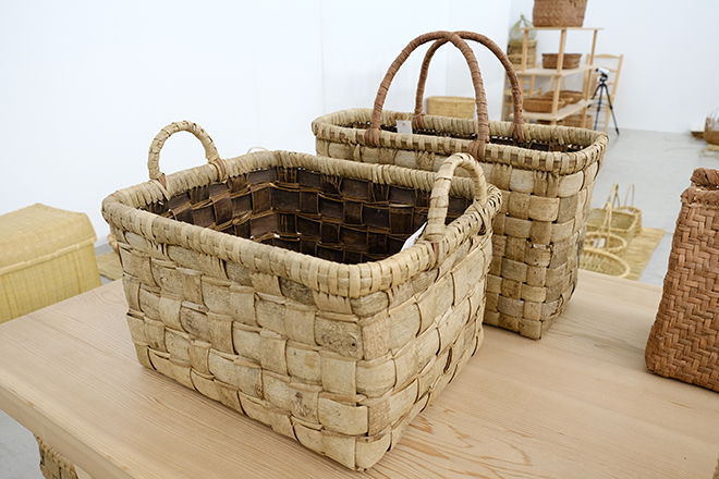 京都・美山の重要伝統的建造物群保存地区にて、手仕事と工藝を組み合わせた作品を中心に制作するコズミックワンダー。籠に焦点をあてる「にほんくらし籠」展は今年で3回目を迎えた。コズミックワンダーの現在の制作過程において、里山で暮らし制作を続ける方々との出会いが自然と生まれ、発表の場所である東京・南青山のCenter for COSMIC WONDERで工藝の展覧会を企画し開催している。会場で展示販売している秋田から沖縄までの籠の数々は、一軒一軒職人の元を訪ね歩き、一年をかけて制作してもらい、集めた籠たちだという。
