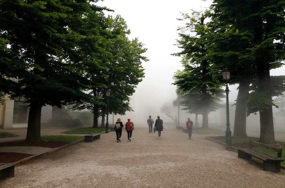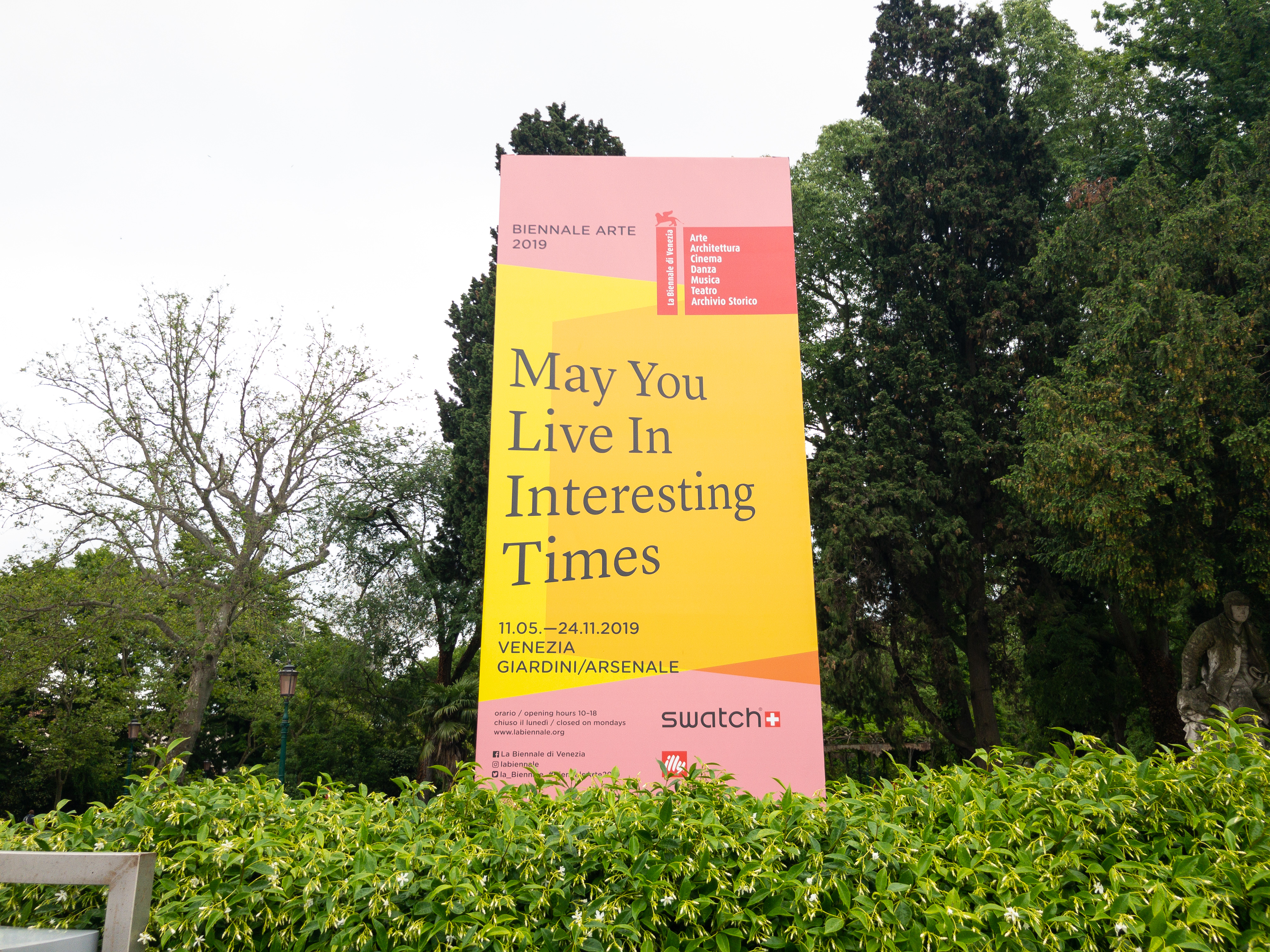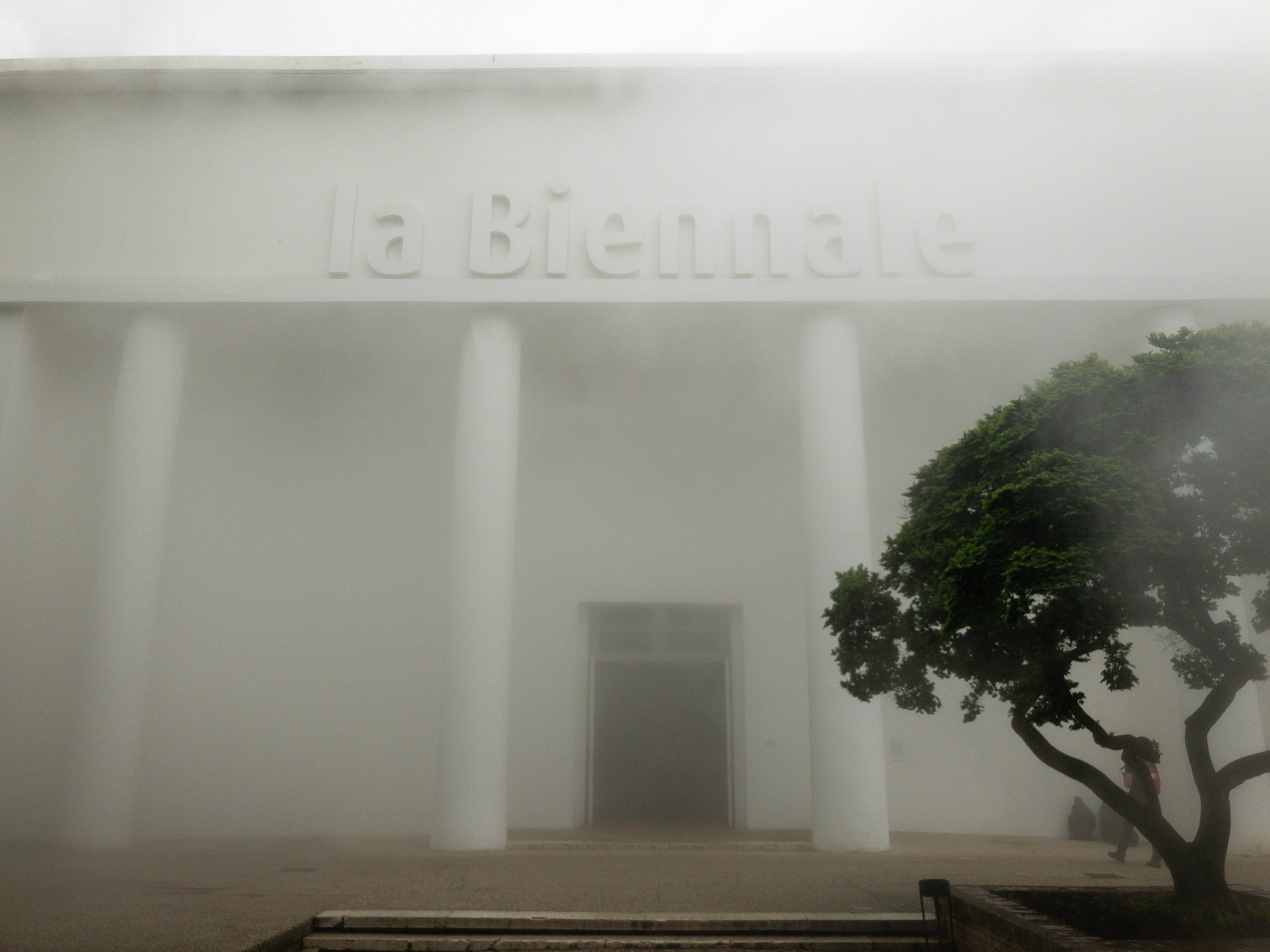 朝は道すがらのバッカロで、マッキアートと、トラメッツィーノという小さなサンドイッチを食べて、ヴァポレットで目的地に向かう。ジャルディーニ駅に到着すると、今年のビエンナーレのテーマ「May You Live In Interesting Times(数奇な時代を生きられますように)」と掲げられた看板があった。公園を抜け、前が見えないほど濃い霧の中に(これもLara Favarettoによるインスタレーション作品)「la Biennale」と大きく書かれた白亜の館がそびえ立つ。ヴェネツィア・ビエンナーレのメイン会場。しばし立ち止まってその文字を見上げる。海を越え、霧を抜け、やっと再びこの場所にたどり着いた、と思う。