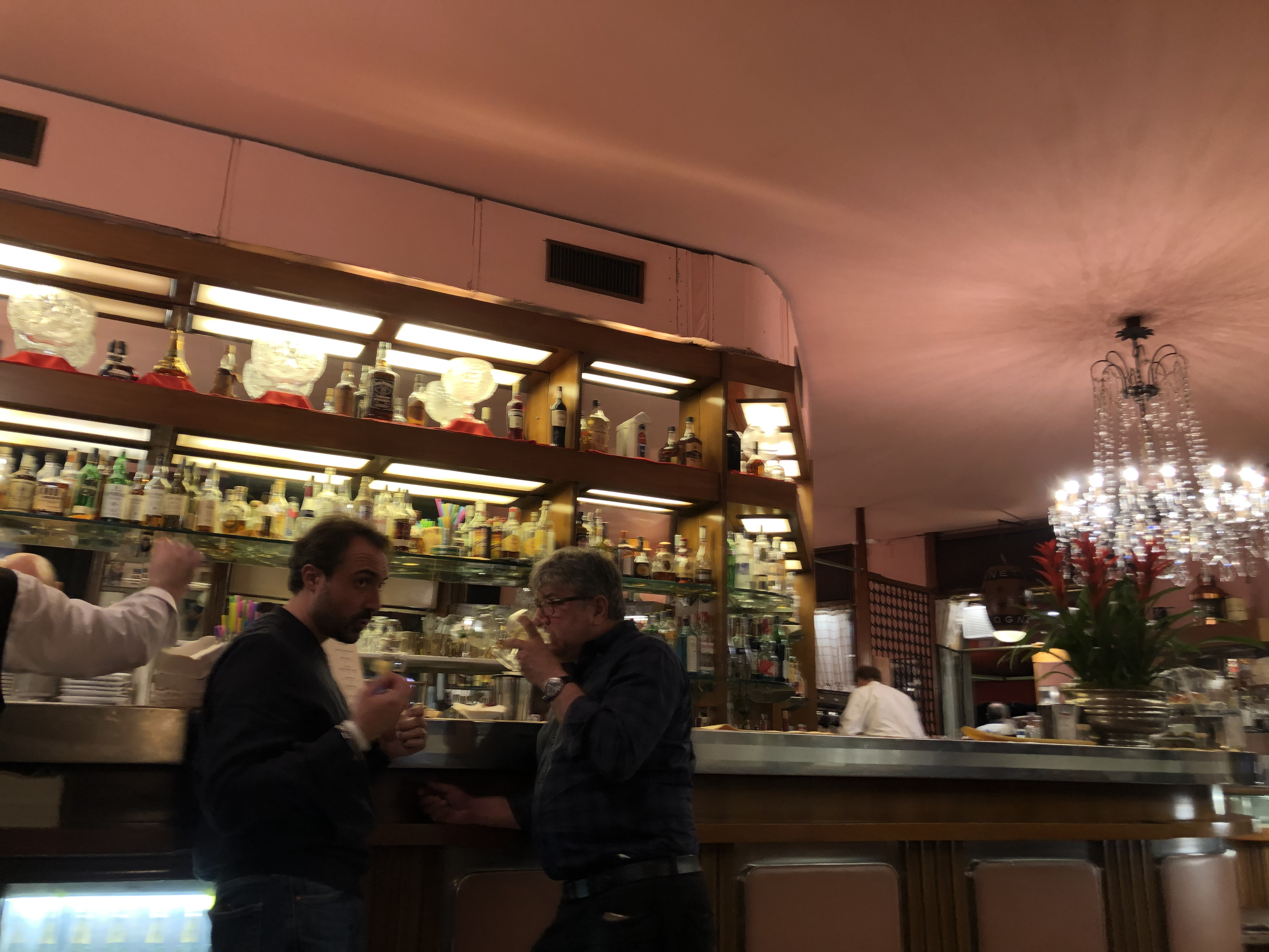 Bar Bassoの名物はネグローニ。ネグローニはカンパリ、ベルモット、ドライ・ジンを合わせたカクテルだが、この店ではジンの代わりにプロセッコを用いる。食前に飲むと、苦いスピリッツとプロセッコの爽やかさが空腹に心地よい。ワインボトルのような高さのある巨大なグラスで出されるそれはなるほど美味で、ああミラノ、いいね、とまだ何も見ていないうちから声が出る。そうでしょうと得意げにいう夫は、数年前にイタリアのキュレーターチームと仕事をした際、ここで朝まで飲んだそうで、そのときから家族で再来したかったのだと言った。クリエイターが集まるバーらしいが、見渡す限り地元の人ばかりで、気取りはゼロ。ウェイターの初老の男たちも異様に明るいわけでも不親切でもなく、昨日と同じ仕事を今日もやっているだけという都会的な粋を漂わせる。ポテトチップスとオリーブの、味気ないくらい簡単なアペリティーボなのに、あまりのネグローニの美味しさに、そして店内の心地よさに、もう少しここで夕方と夜が溶け合っていくのを楽しむことにする。