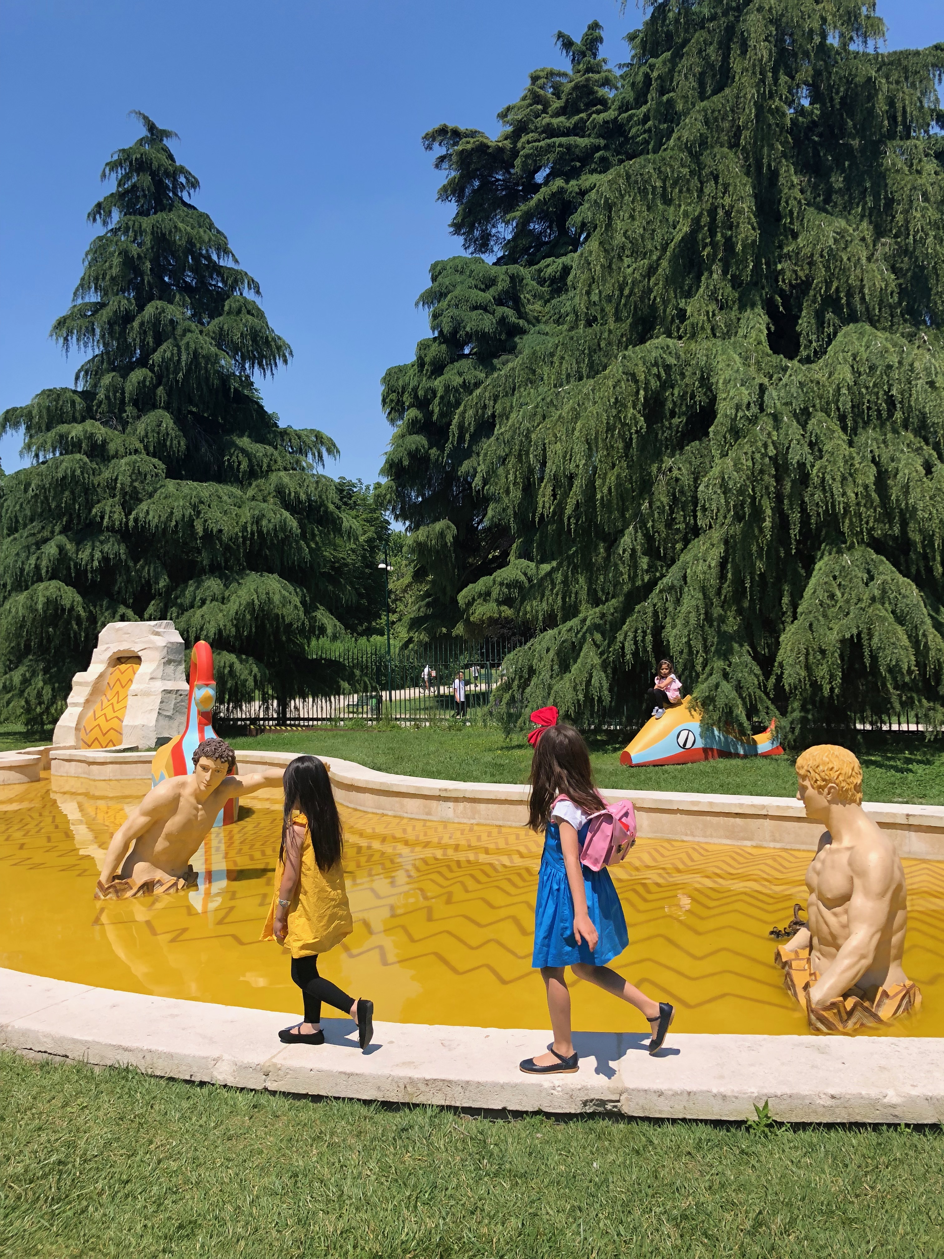 少女たちは庭にある彫刻作品、1973年に設置されたというジョルジュ・デ・キリコの「Mysterious Baths Fountain」のまわりできゃあきゃあ黄色い声をあげて遊んでいる。食事も終わり、今日しか行くチャンスのない美術館「Hangar Bicocca」に行こうかというときに、長女がキリコの中に貯めてある水の中に落ちた。恥ずかしさでべそをかく長女のまわりで少女たちが「まだまだ遊ぶ」と飛び跳ねる。ではまた夜に、と約束をして、びしょ濡れの長女を連れて美術館を去った。