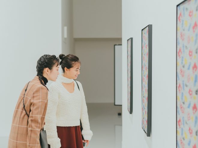 ふたりがさっそく見入っているのは、フランス生まれ・ブリュッセル在住のピエール・ルギヨン作「Mérida(Painting for Sale, by the Meter)」。福岡伝統の絣(かすり)職人と共同制作した「ペインティング」の模様は、なんとメキシコのバーで見かけた迷彩柄風の壁画とか。「斬新な和洋折衷! 現代アートは解説によって二度楽しめるから、パンフレットやチラシを熟読したくなります」と甲斐さん。