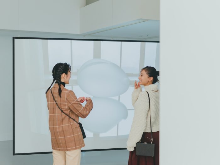 なにやら意味深なモニターとヘッドフォンを見つけて、恐る恐る装着。すると、聞こえてきたのは「ハァハァ…フゥフゥ…」と耳元でささやくような呼吸のリズム。よく見るとモニターにはうっすらと、呼吸する人々の顔面が映し出されていました。“息を合わせる”という行為を映像で表現する片山達貴の、作品名はずばり「息の波」。「鳥肌が立った…」とつぶやくふたり。芸術は時に、刺激が付きものです。