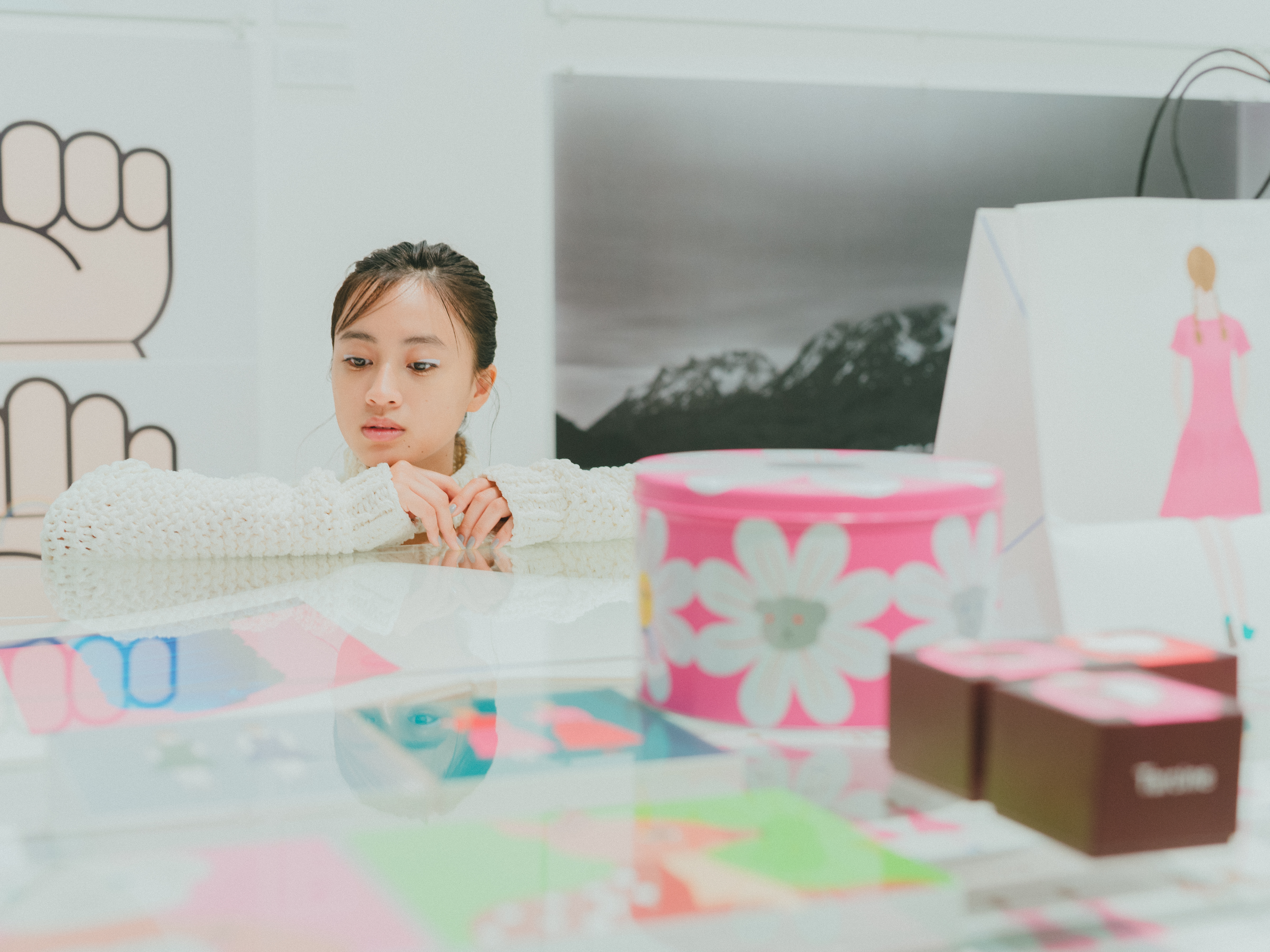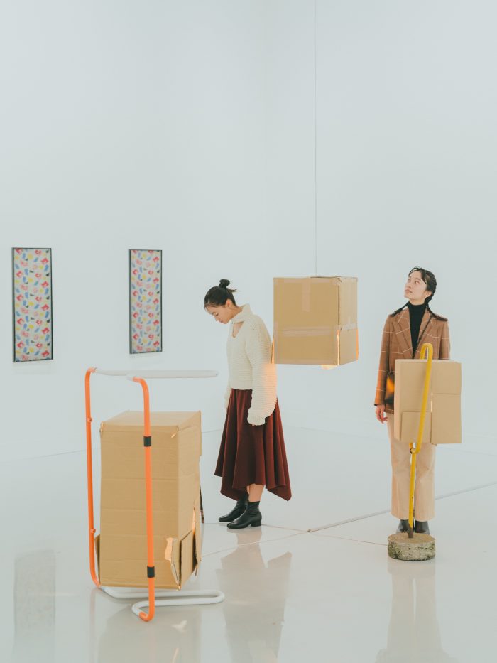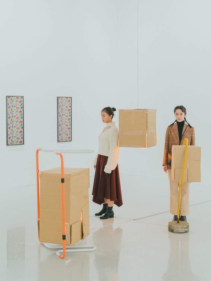 会場中央で存在感を放つ不思議な段ボールアートは、ストックホルム生まれ・ベルリン在住のクララ・リーデンが、この展覧会のために東京に滞在して制作したという新作。街にあるゴミ箱や標識、フェンスなどさまざまな素材を利用するリーデン。今回東京で見つけたのは、段ボールと、工事現場の案内などで使われるポールでした。「私たちがふだんなにげなく目にしているものも、海外のアーティストには面白い素材に見えているんですね!」と驚く玖瑠実さん。作品のそばにそっと佇んでみれば、ふたりの姿もまるでアートの一部みたい。