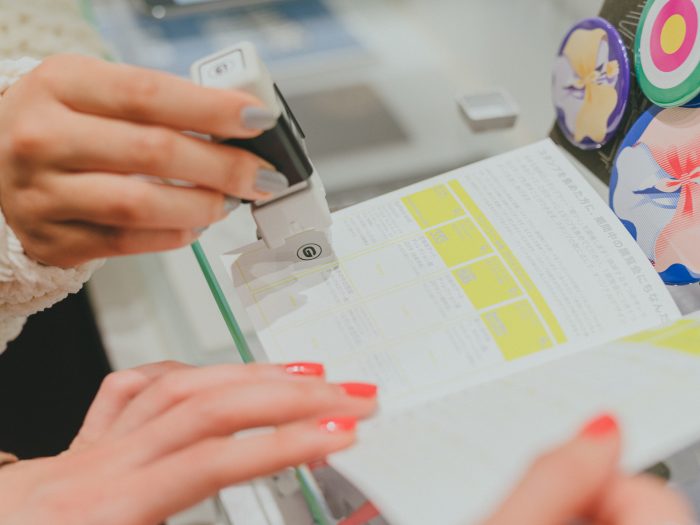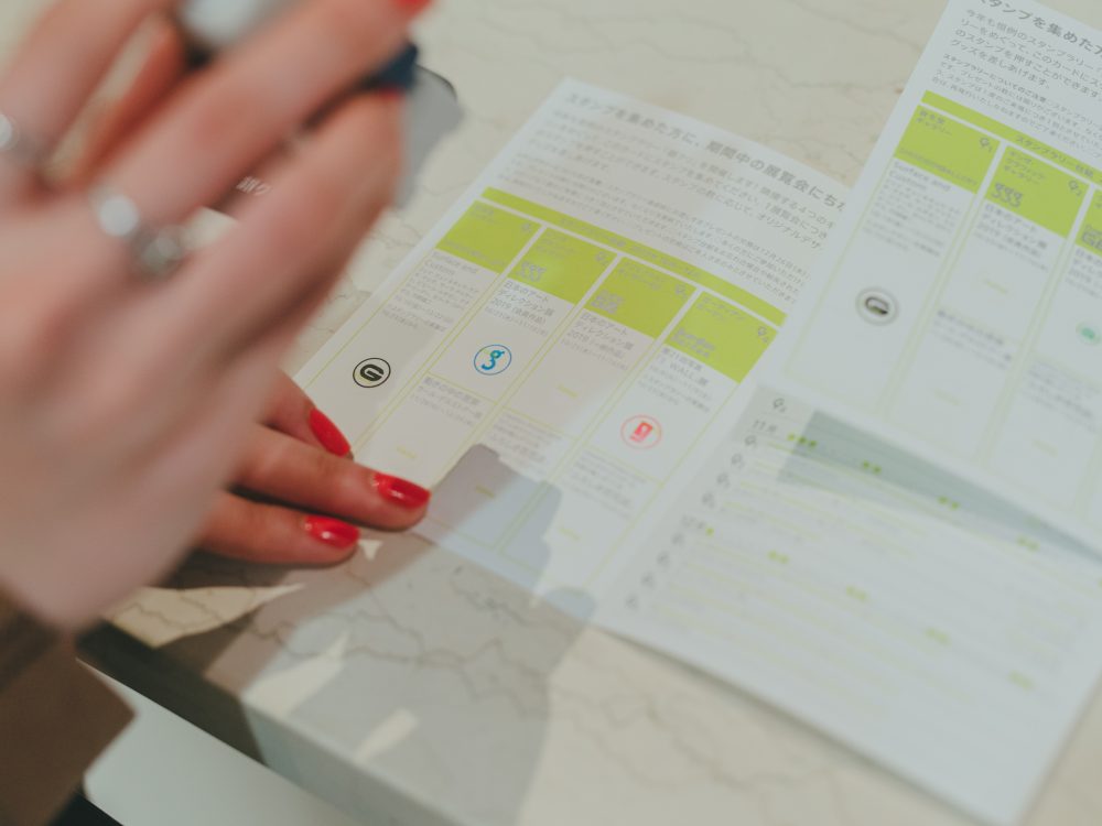 ペインティングから映像、立体作品まで、バリエーション豊かなアートに触れたあとは、お待ちかねのスタンプタイム。各会場の受付に設置されている「銀クリ2019」のスタンプ台紙を受け取って、指定枠にポンッ。1展覧会につき、スタンプひとつ。3つ集めるごとに、オリジナルの缶バッジがもらえます。「スタンプラリーって、なんだかワクワクするよね」「今日は一気に巡って缶バッジをゲットしよう」と盛り上がり中。