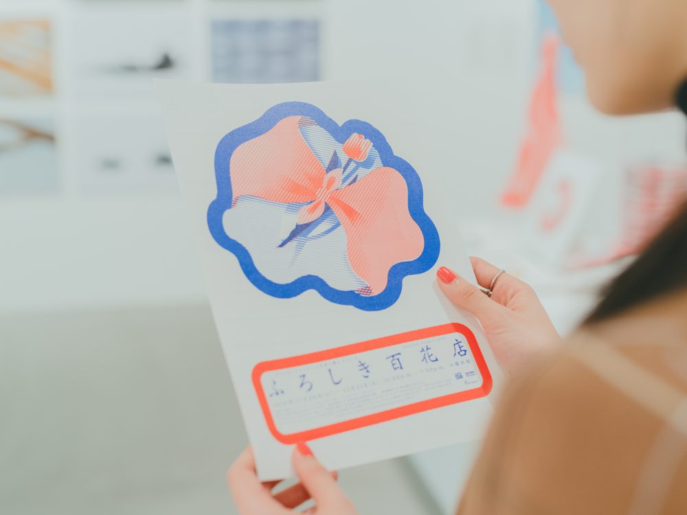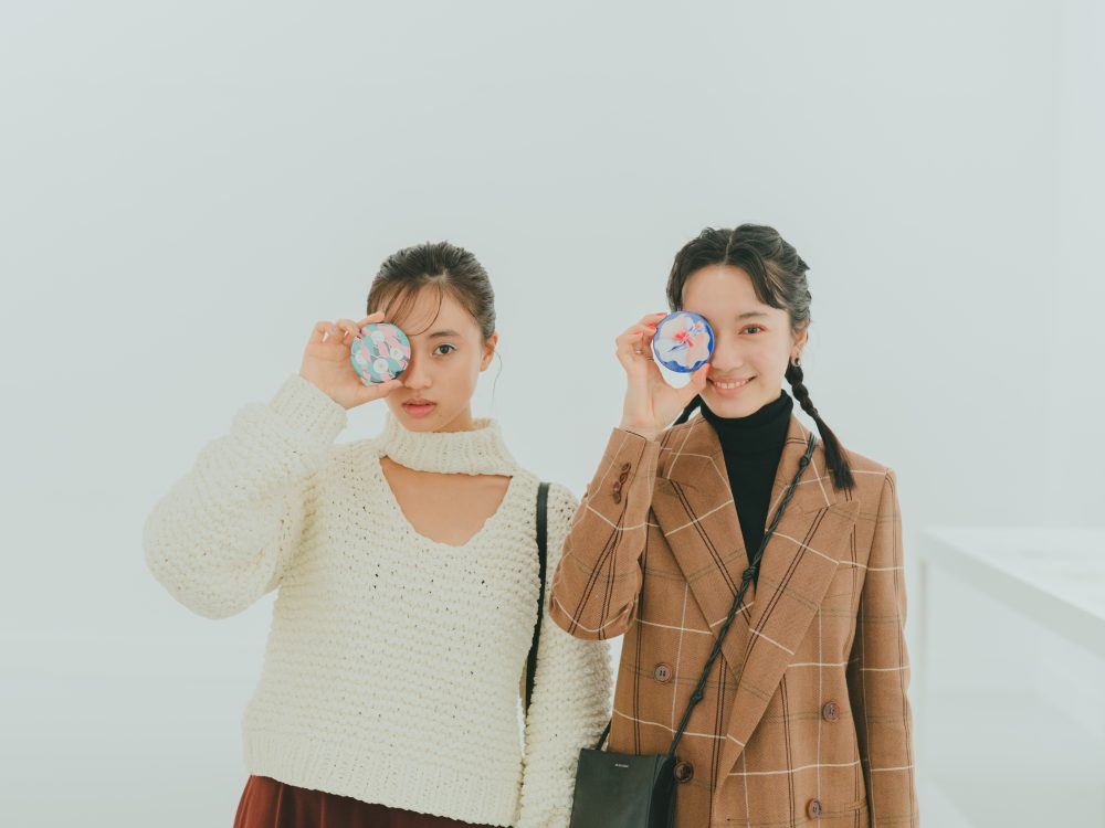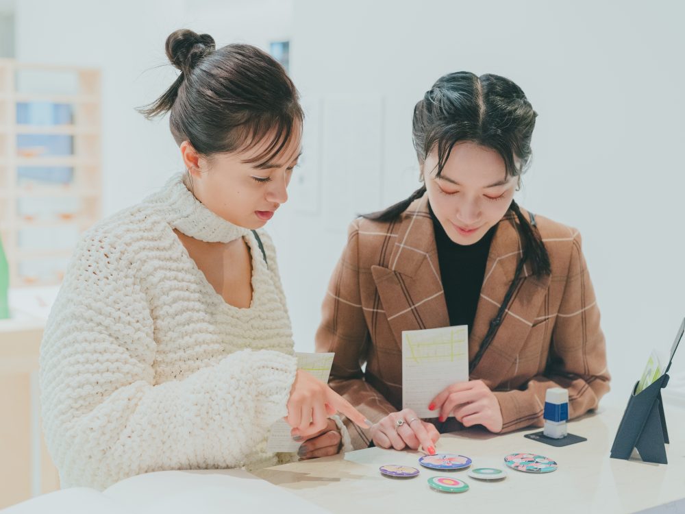 たっぷり迷った結果、玖瑠実さんは井上千聖デザインの愛らしい唐草柄、甲斐さんは一乗ひかるが描き下ろしたふろしき柄のイラスト缶バッジに決定! どちらも直径76mmと大きめサイズもポイントです。ふろしきのイラストは、「ガーディアン・ガーデン」と「クリエイションギャラリーG8」で同時開催される「ふろしき百花店」のメインビジュアルにもなっているもの。「スタンプラリーの対象ギャラリーが全部ご近所にあるから、3カ所すぐにハシゴできて、缶バッジがもらいやすいのもうれしいですね」とふたり。お気に入りのバッジを手にポーズ。