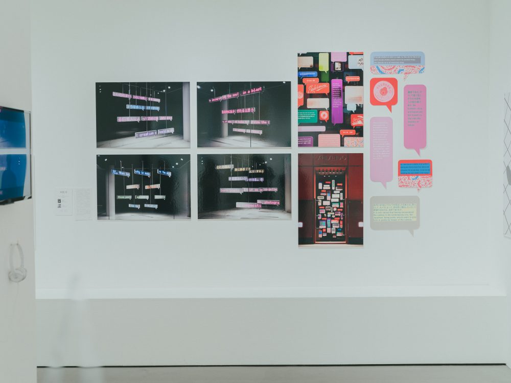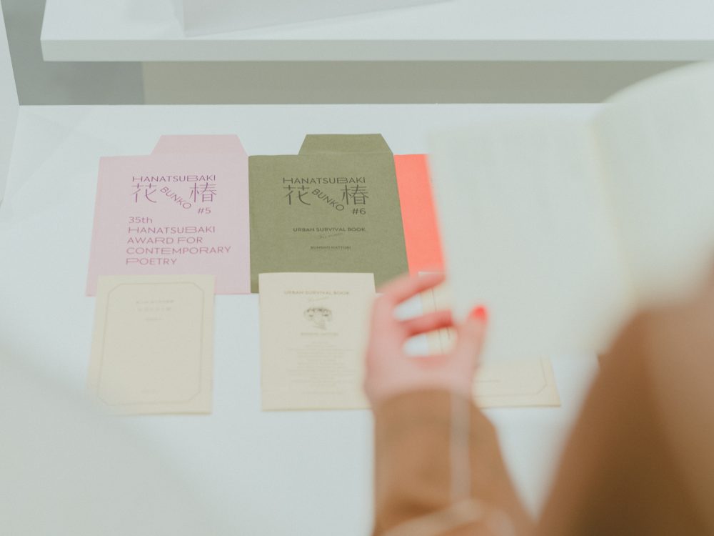 こちらでも、『花椿』や資生堂ゆかりのデザインを見つけました。上は、『花椿』の別冊付録「花椿文庫」のブックデザイン。そして下は、今年のADC賞受賞作品でもある、資生堂のアートディレクター・丸橋桂による、資生堂銀座ビルのウインドウディスプレイ「Wording from Shinzo Fukuhara」。吹き出しを模した複数のディスプレイに、資生堂の初代社長・福原信三のことばがネオンのように浮かび上がる、不思議でポップなビジュアル。設置当時、通りを行き交う人々の目を奪った話題の作品です。