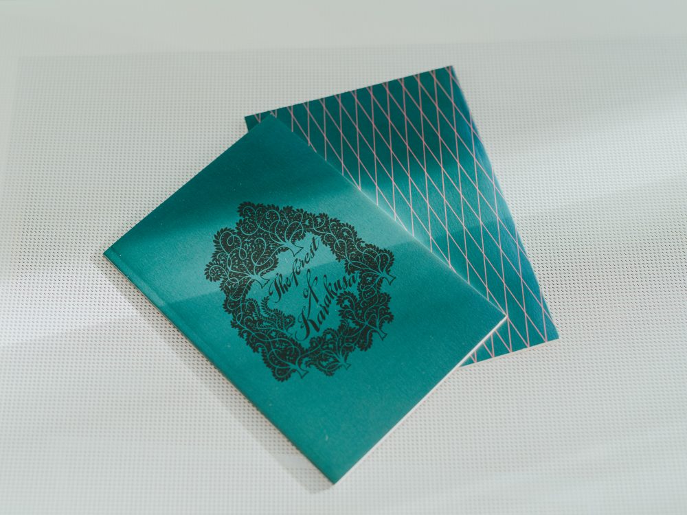 スタンプ6つで缶バッジをもうひとつ、そして7つすべて集まったら、前述のアートディレクター・丸橋桂デザインのオリジナルノートが進呈されます(数量限定、なくなり次第終了)。表紙には、長年“資生堂唐草”を描き続けてきた描版師・薄希英(すすき・まれひで)による、『花椿』のための新しい唐草模様「Forest of Karakusa」が。裏は、繊細なピンクの線の格子。とってもハイカラな雰囲気の1冊です。
