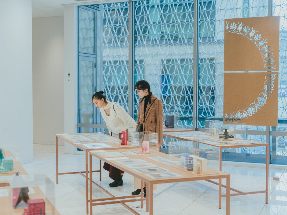 ここからは、少しだけ番外編。「銀クリ2019」のスタンプラリー対象ではないけれど、併せて訪れたい展示が近くで開催中だと聞きつけて、「クリエイションギャラリーG8」から徒歩5分ほどのところにある「資生堂銀座ビル」へ向かうことに。こちら、実は資生堂の本社、銀座オフィスのビルなのですが、1階のエントランス・ウインドウや2階のコミュニケーションスペースは、会期中なら誰でも自由に観覧できる場所として開放されています。