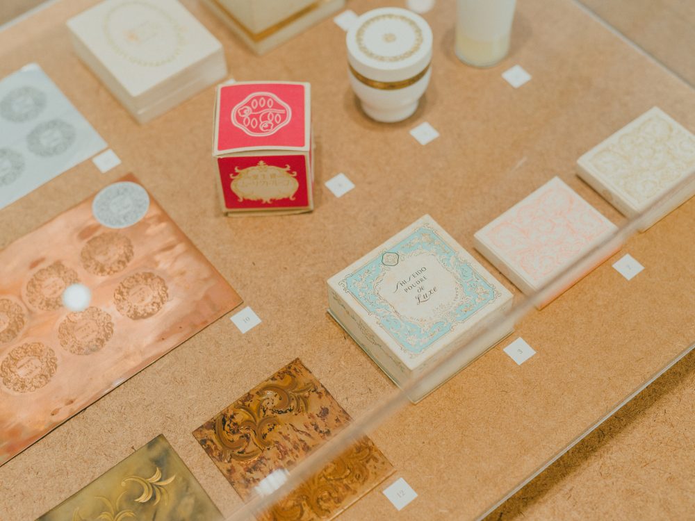 エスカレーターでコミュニケーションスペースへと上がると、そこは一面、多種多様な唐草模様の世界! 唐草は、植物の生命力と、しなやかに無限に拡がる可能性を表し、資生堂を象徴するデザインとして現在まで受け継がれているもの。2階では、描版師・薄希英が約60年にわたって描き続けた原画や、制作プロセスにまつわるものを初公開(2階の会期は12月13日まで)。歴代の唐草模様が施された貴重な商品や、歴史的なグラッフィックをひとつひとつ眺めながら、「なんて繊細で美しいデザインなんだろう…」と感動しきり。まさに女子心をわしづかみにされる展示でした。