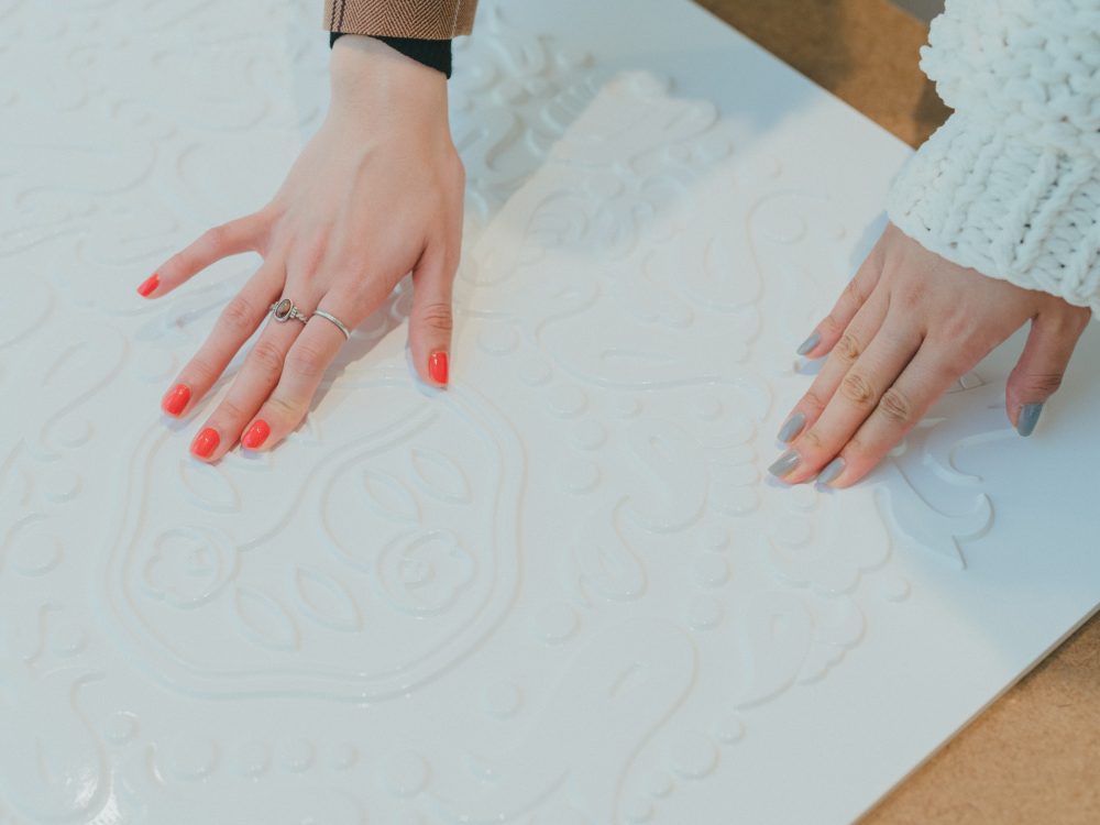 会場には“さわれる”唐草も。しばし目を閉じて、手のひらに意識を集中しながら凹凸を触感で体験。「今日は、見たり聞いたり触ったり、いろんなタイプのアートにたくさん出合いました。ぜんぶ徒歩圏内なのに、なんだかアート巡りの旅に出たみたいな充実感!」と甲斐さん。玖瑠実さんは「初めて本格的にギャラリーをハシゴしてみて、もっとアートを知りたいという気持ちが増しました。こうやって芸術に触れている時間そのものも、すごく贅沢で大切なんですね」。