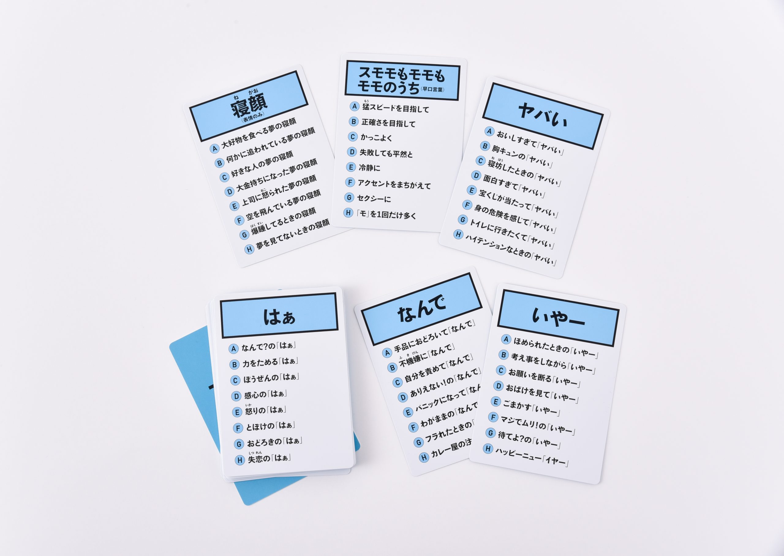 カードに書かれたお題の一言を、声と表情だけで表現するゲームです。例えば、「おどろきのはぁ」「失恋のはぁ」。或いは「おいしすぎてヤバい」「胸キュンのヤバい」。または、「フラれたときのなんで」「手品に驚いてなんで」等々。
