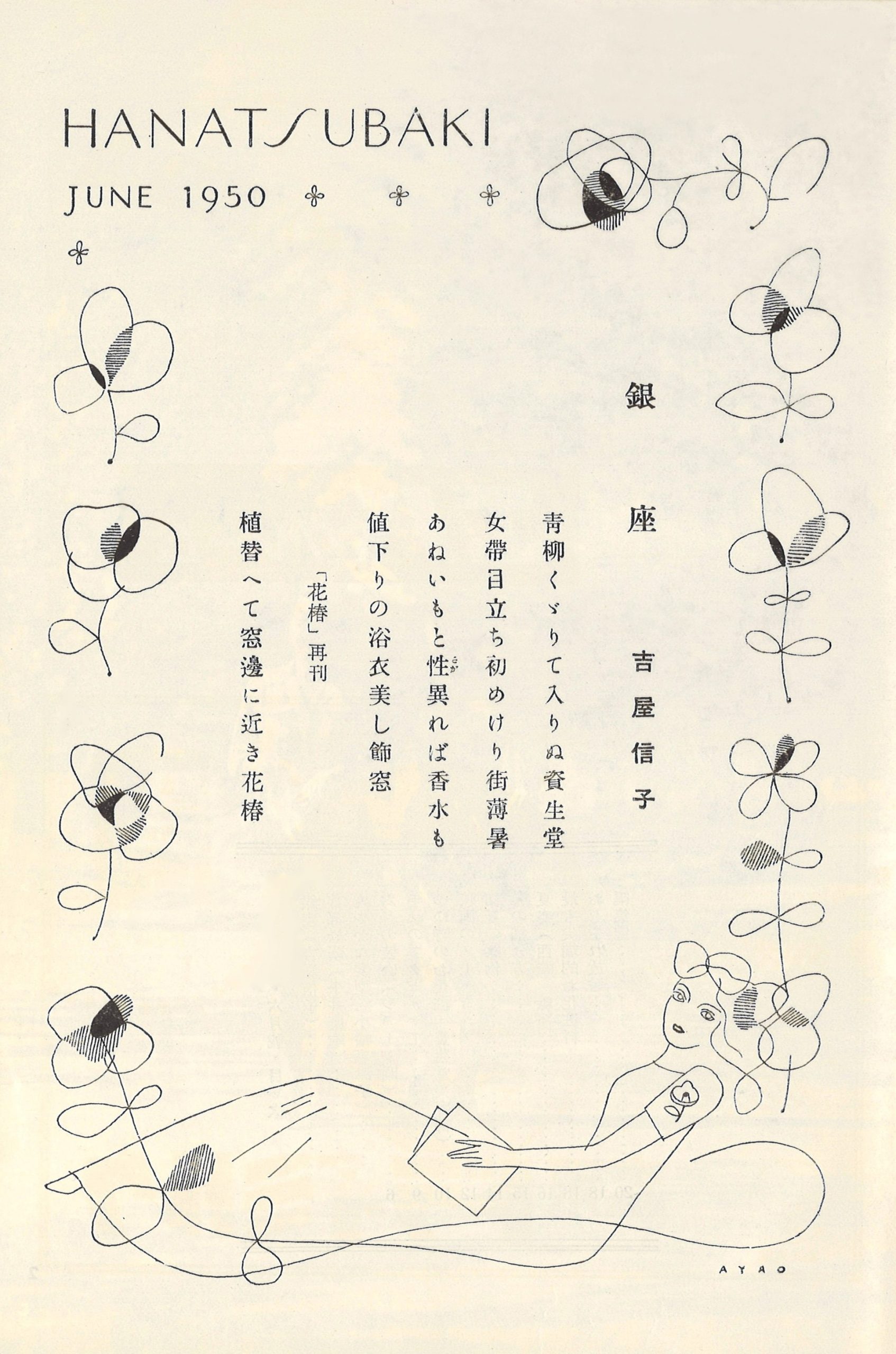 『花椿』は戦時中に一時休刊し、1950年に復刊します。その復刊号(1950年6月号)で詩を寄稿したのは、今も読み継がれる少女小説『花物語』で、当時一世を風靡していた作家の吉屋信子でした。「銀座」をテーマに、香り立つ瑞々しい詩が掲載されています。