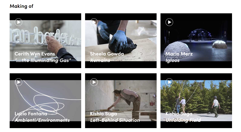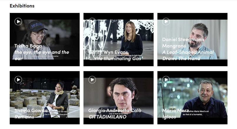 作家自身による展覧会紹介や、きれいにまとめられたメイキング、イベント記録を見ることができます。英語音声/イタリア語字幕が多い中、日本語音声の菅木志雄さんのインタビューや、花椿でも昨年京都で開催された個展を紹介していたジョーン・ジョナス(記事はこちらからどうぞ)の展覧会も。Google Arts & Cultureとも連動しているので、いくつかの展覧会はオンラインビューイングが可能です。家にいる時間が長くなると視界も狭くなりがちですが、ミラノの広大なスペースに展示している様子は気分転換になるかもしれません。