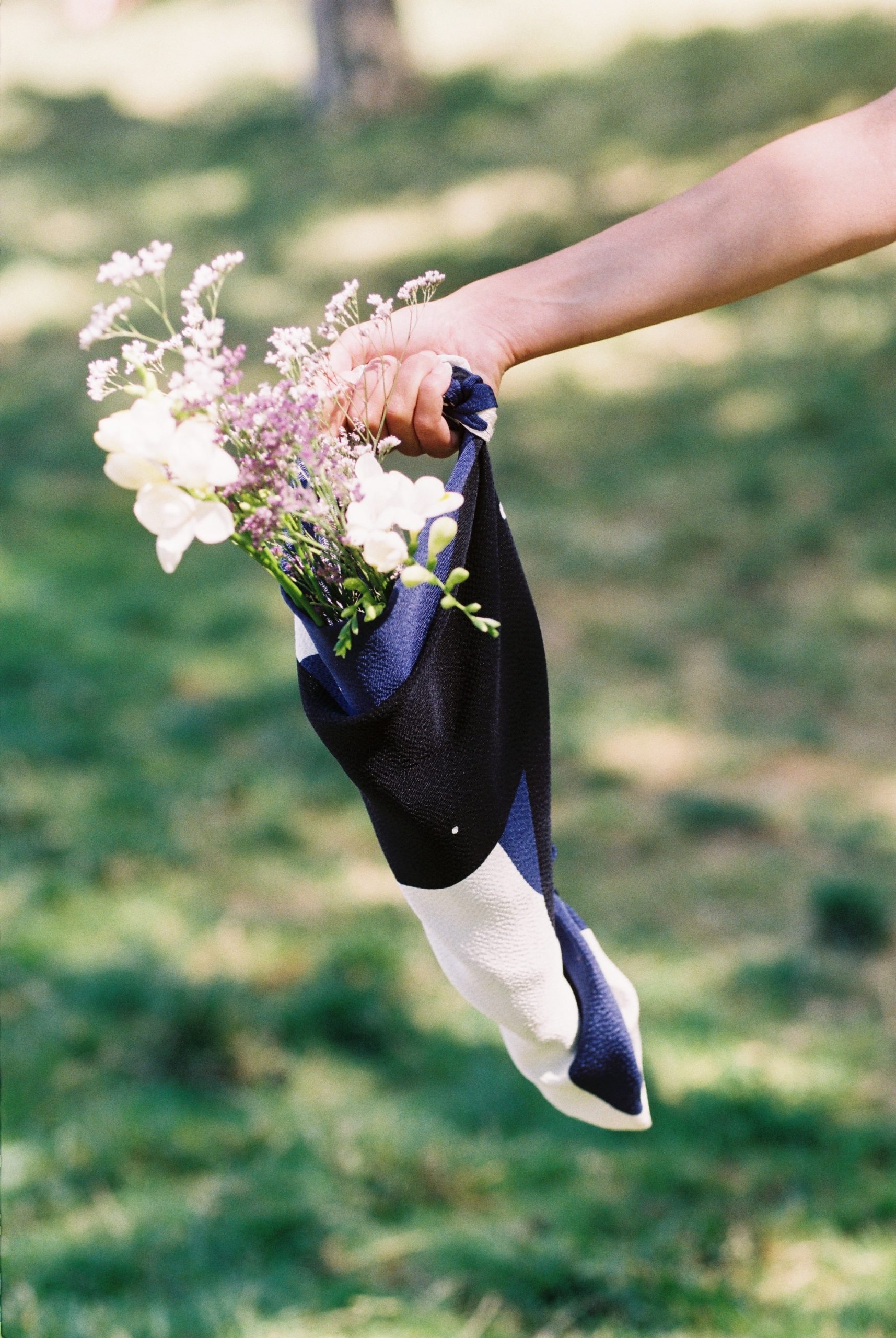 風呂敷文化は、相手を思いやる繊細な気持ちと細やかな心配りが形となって現れたものだと思います。公共財をどう扱うか、が問われている地球環境問題でも、他者や他の生きものを思いやりながらもセンシティブに感じ取る姿勢や、想像力が不可欠です。そういった意味でも、機能性を超えて、日本の伝統文化から世界が学べるものはたくさんあると思います。僕は風呂敷を額装したり、物を包んだり、カバンの上にフワッと乗せたり、部屋にあるものに被せたりして、その時々で変化する図柄を楽しんでいます。風呂敷の両端を結ぶと、両手が中のものを包み込むような図柄にしていて、そんな驚きもあり、陰影が強調される丹後ちりめんの素材感や、色合いも相まって、友人たちからも評判はとても良いです。