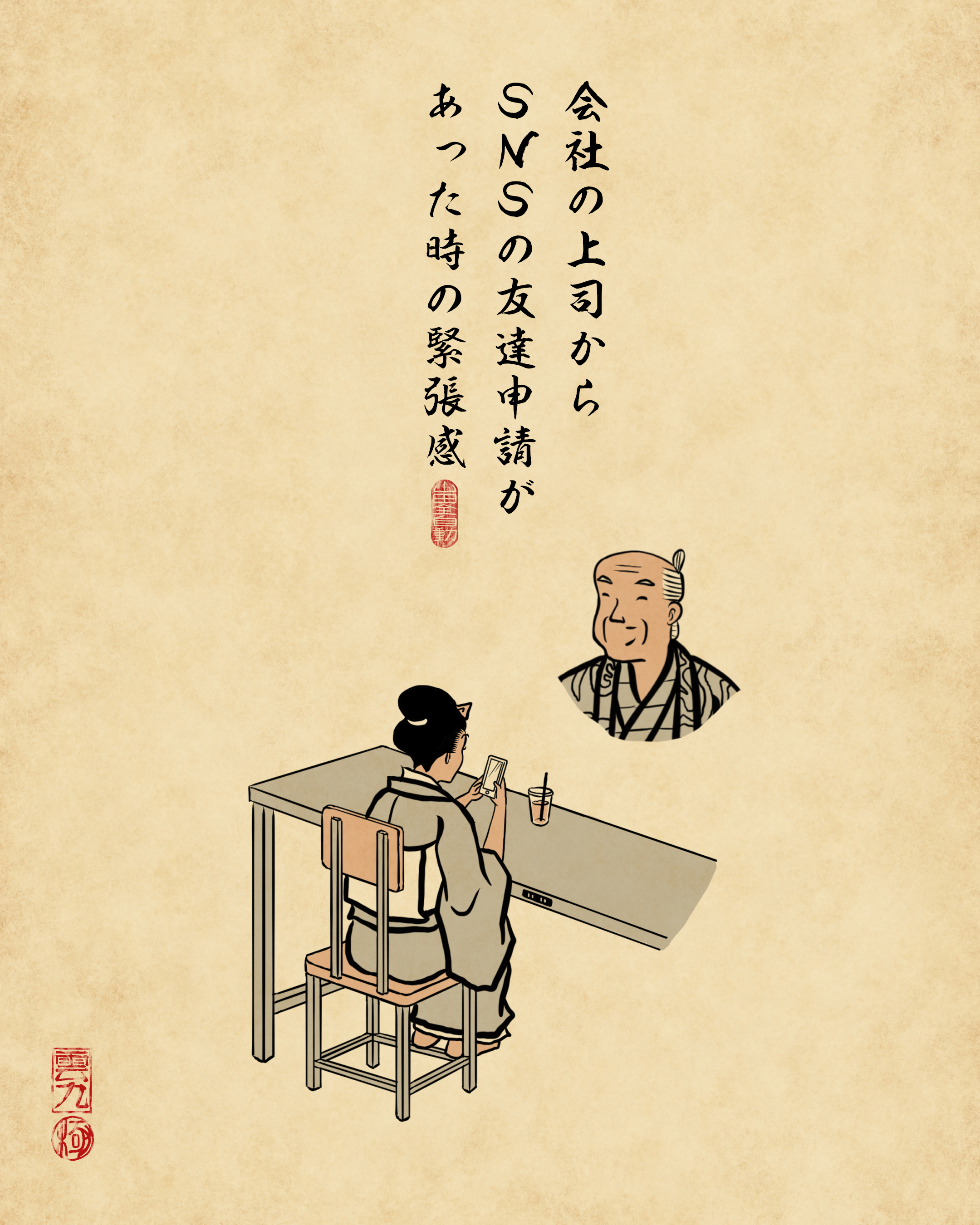 佐賀出身の浮世絵イラストレーター。ちょんまげ姿の人物のイラストに誰もがあるあると言ってしまいそうな一言を添えた作品が人気となりInstagramのフォロワーは30万人超え。