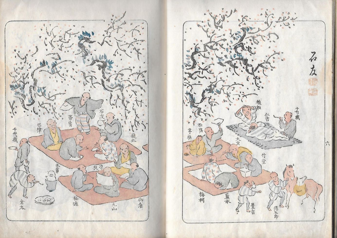 ここでキャンベルさんは1冊の本を見せてくれた。「1861年に出版されたこの本には、大分市吉野の天満宮の梅の木の下で酒盛りをしている人々が多色刷りの木版画に描かれていて、とても優しい雰囲気に溢れています。ひょうたんをもっている若者は、これからお酌をするのかな。タイムカプセルに乗った気分になります。私がライフワークにしている江戸時代の版本は、3回人生を送ったとしても全て読むことはできないでしょう。まあ、1回の人生の長さにもよりますけど(笑)」