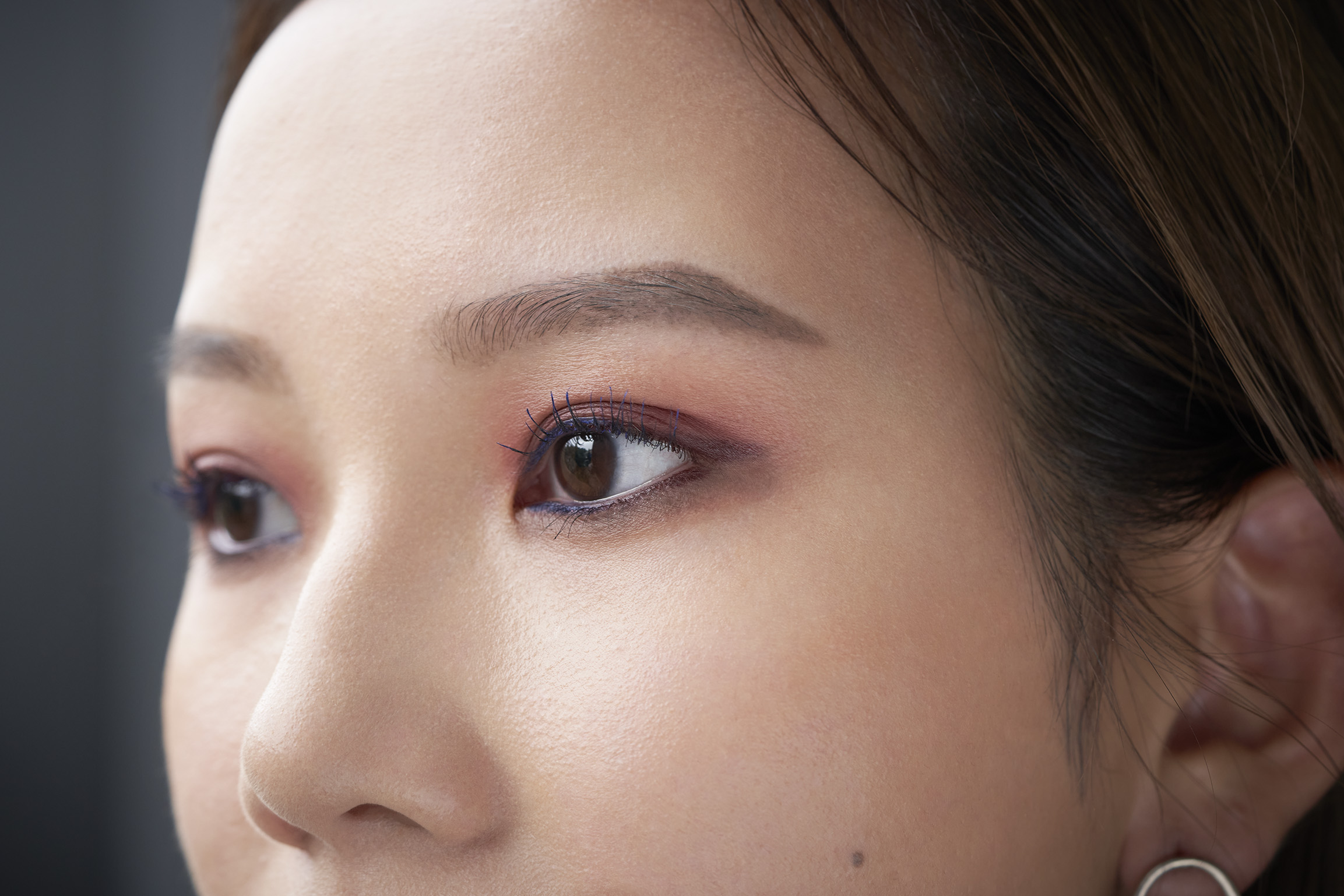 トレンドのレッド系のカラーをメインにした目もとに、外しのテクニックとして、アイライナーとマスカラに、差し色としての青をチョイス。はじめに、ペンシルタイプのアイカラーSHISEIDO カジャルインクアーティストの肌なじみのよいレッドAzuki Red/04を上まぶた全体になじませます。差し色の青は、同じくカジャルインクアーティストのGunjo Blue/08を下まぶたの目頭寄りに忍ばせ、カラーマスカラのSHISEIDO コントロールカオス マスカラインク SAPPHIRE SPARK/02をまつ毛の先端だけに軽くのせるようにつけます。「目もとに青をポイント的に使用することで、抜け感が生まれ、グラマラスな印象へ繋がります」と、尾花さん。