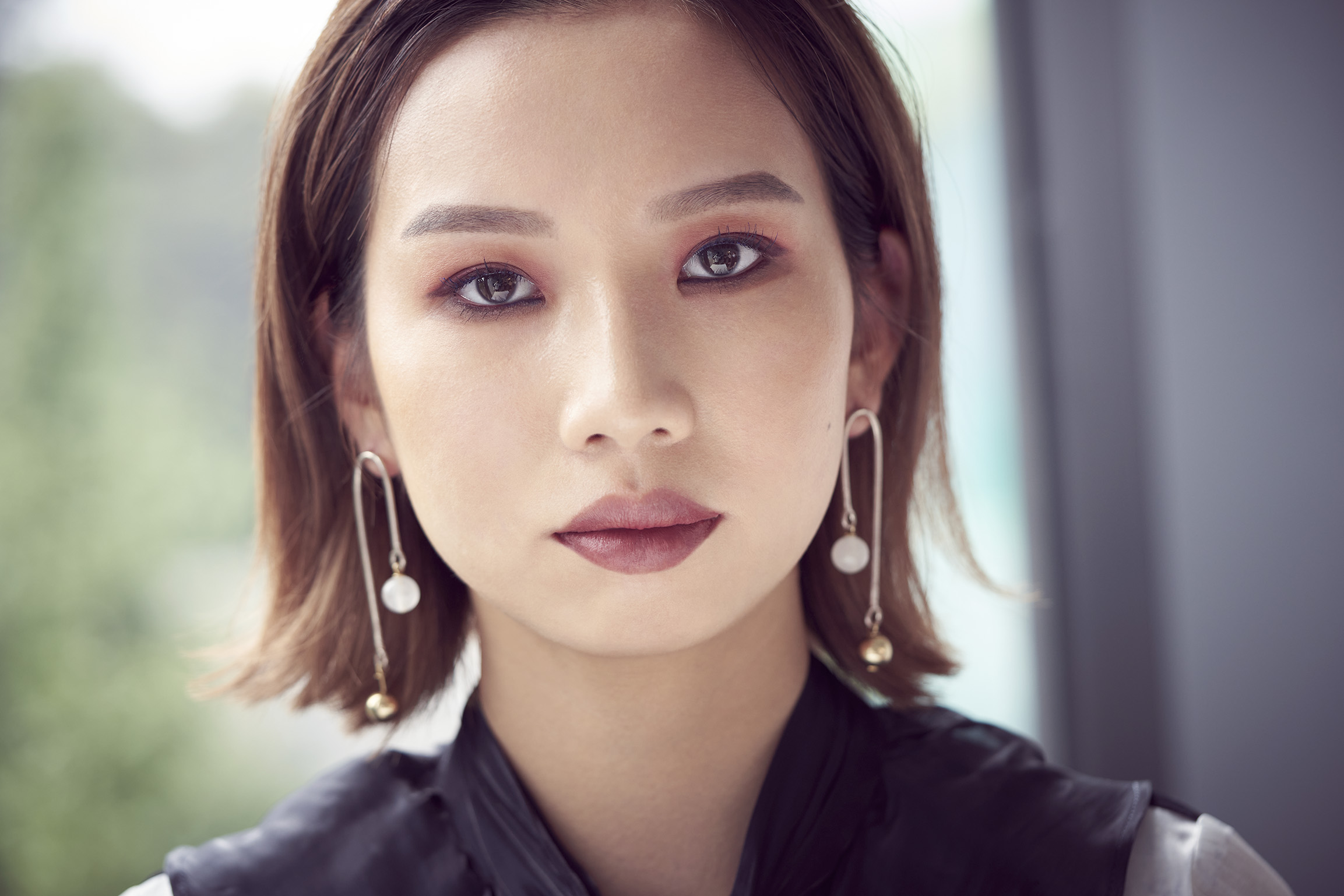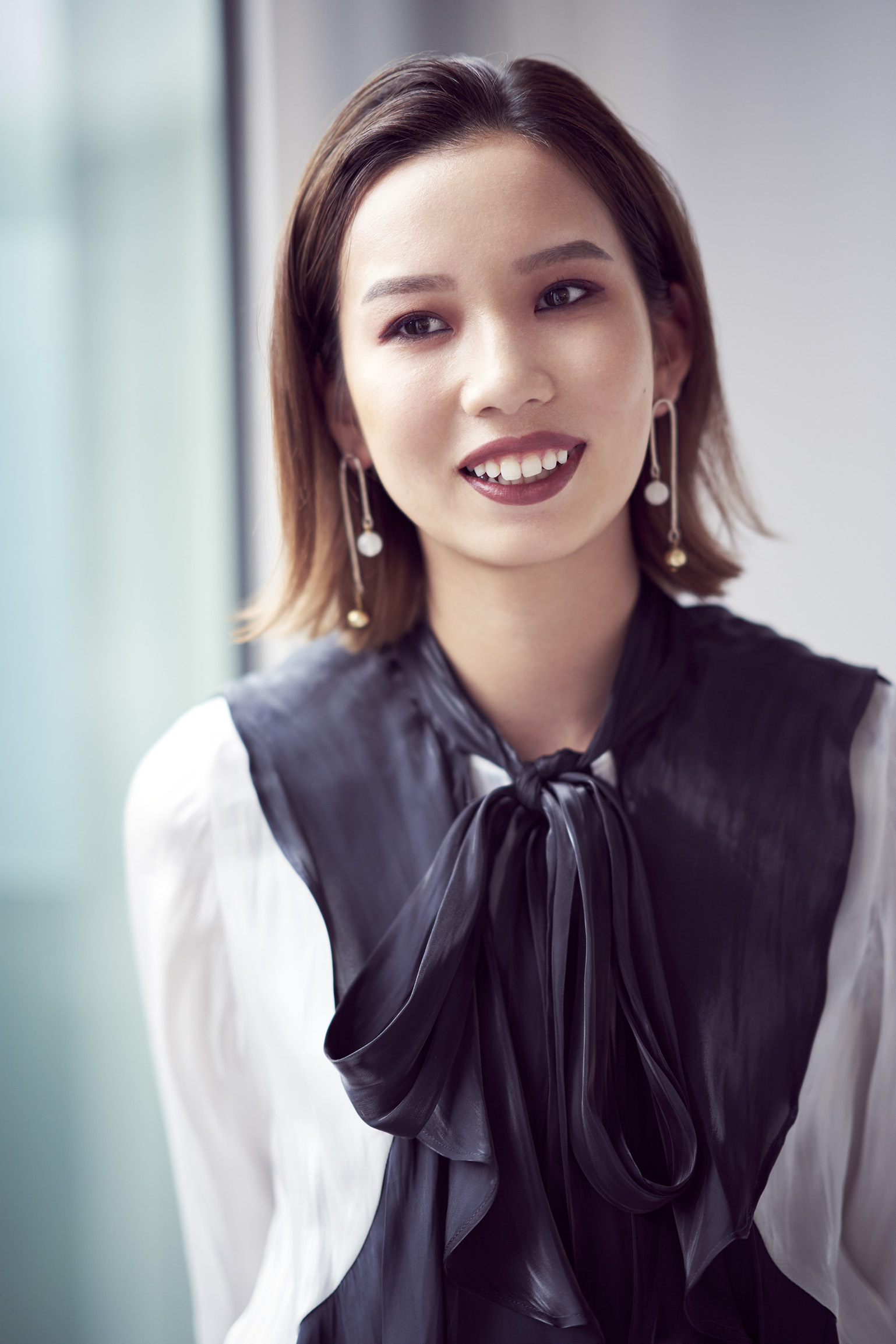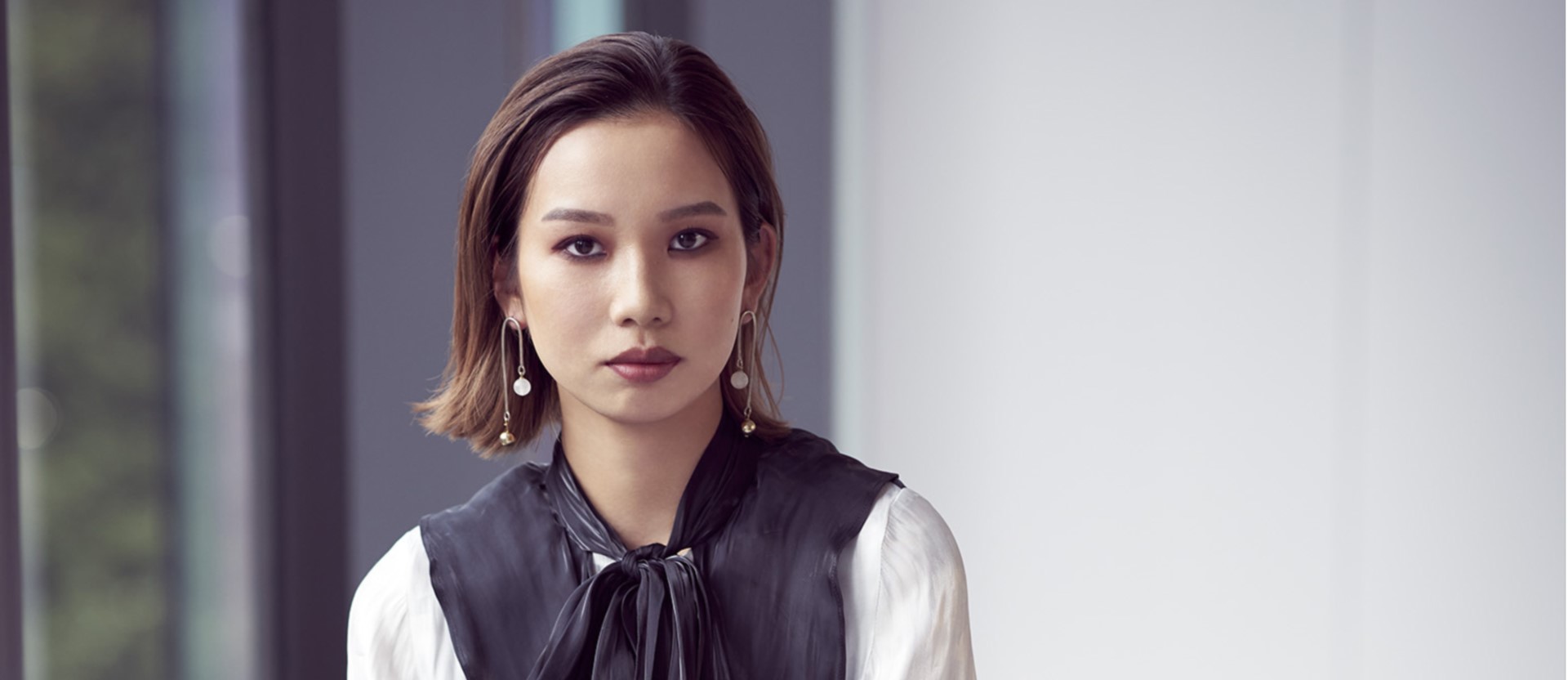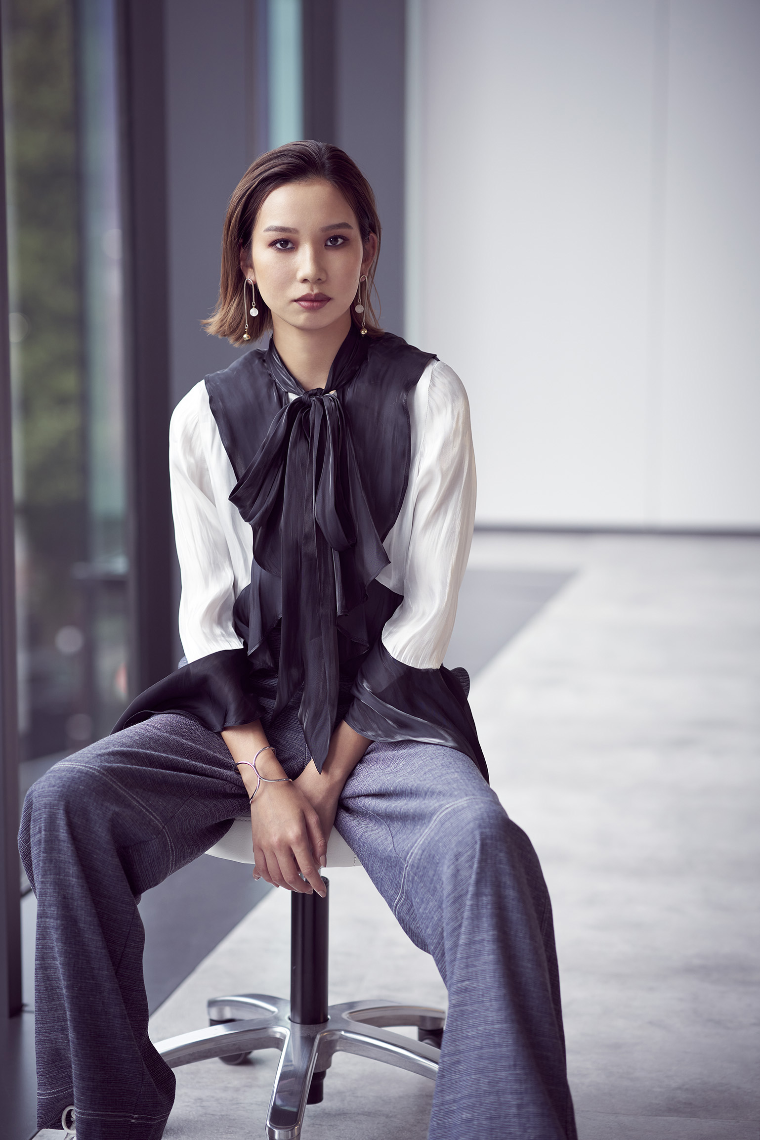 すらりとしたスタイルで、ネイビーのボウタイとフリルがアクセントになった甘×辛ミックスのブラウスを着こなしてしまうシンさん。「シンさんの意志を感じさせる魅力的な目もとを生かしながら、ちょっとした外しのテクニックを取り入れることで、色っぽさを感じるクールビューティーに仕上げてみました」と、メイクを担当したSHISEIDO THE STORE ヘアメイクアップアーティストの尾花純子さん。