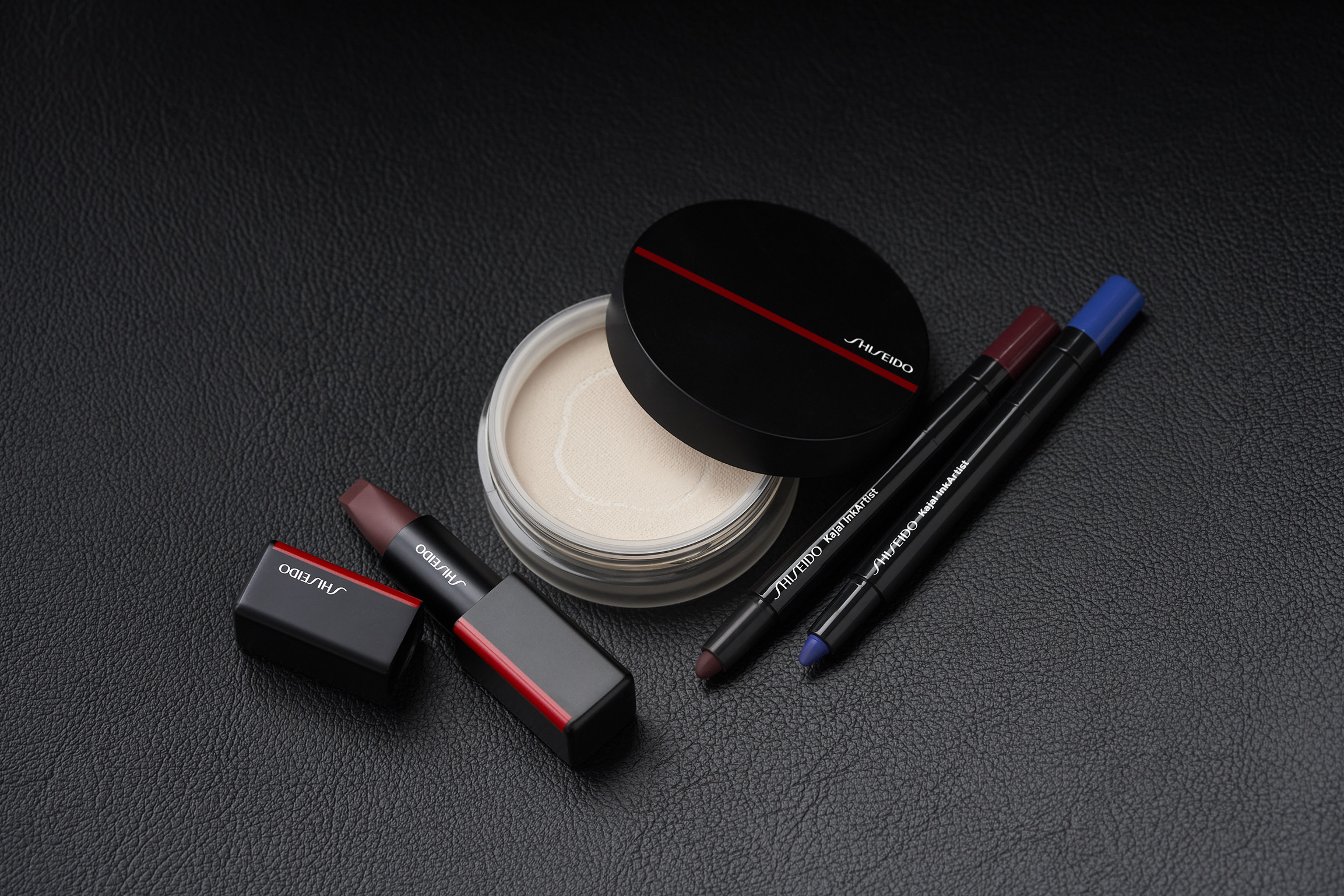 目もとの印象を引き立てるよう、肌、口もとは、マットな質感で揃えます。ピタッと密着してフレッシュな仕上がりが特長のSHISEIDOシンクロスキン セルフリフレッシング ファンデーションでベースを整えた後、SHISEIDO シンクロスキン インビジブル シルク ルースパウダー マットでなめらかで透明感ある肌をつくります。口もとは、目もとのあずき色に近い赤みブラウンを、チークは控えめにして、色のバリエーションを絞ることで、ノーブルな印象が際立ちます。今回使用したSHISEIDOモダンマット パウダーリップスティック Shadow Dancer/531は、血色を感じるブラウンで、唇にさりげないボリューム感を演出する一品です。
