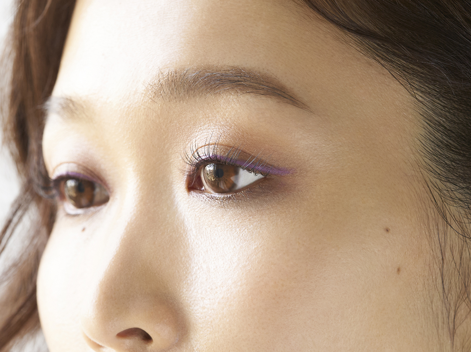 アイホールに、同Sube-Sube Beige/04(マット)を使い陰影を起こし、下まぶたには、同Suru-Suru Taupe/08(シマー)で立体感をオン。続いて、上まぶたの目頭の丸みにそって、上品な輝きが美しい同Horo-Horo Silk/02(スパークル)でラメ感を加え、瞳のフレッシュな印象を引き立てます。アイラインには、ドレスの柄の差し色、紫を取り入れます。アイシャドウと同じく6月に色調追加で登場するSHISEIDOマイクロライナーインクのViolet/09は濁りのない美しい紫。洋服のキーカラーとアイライナーの色をマッチングさせることで遊び心が感じられます。