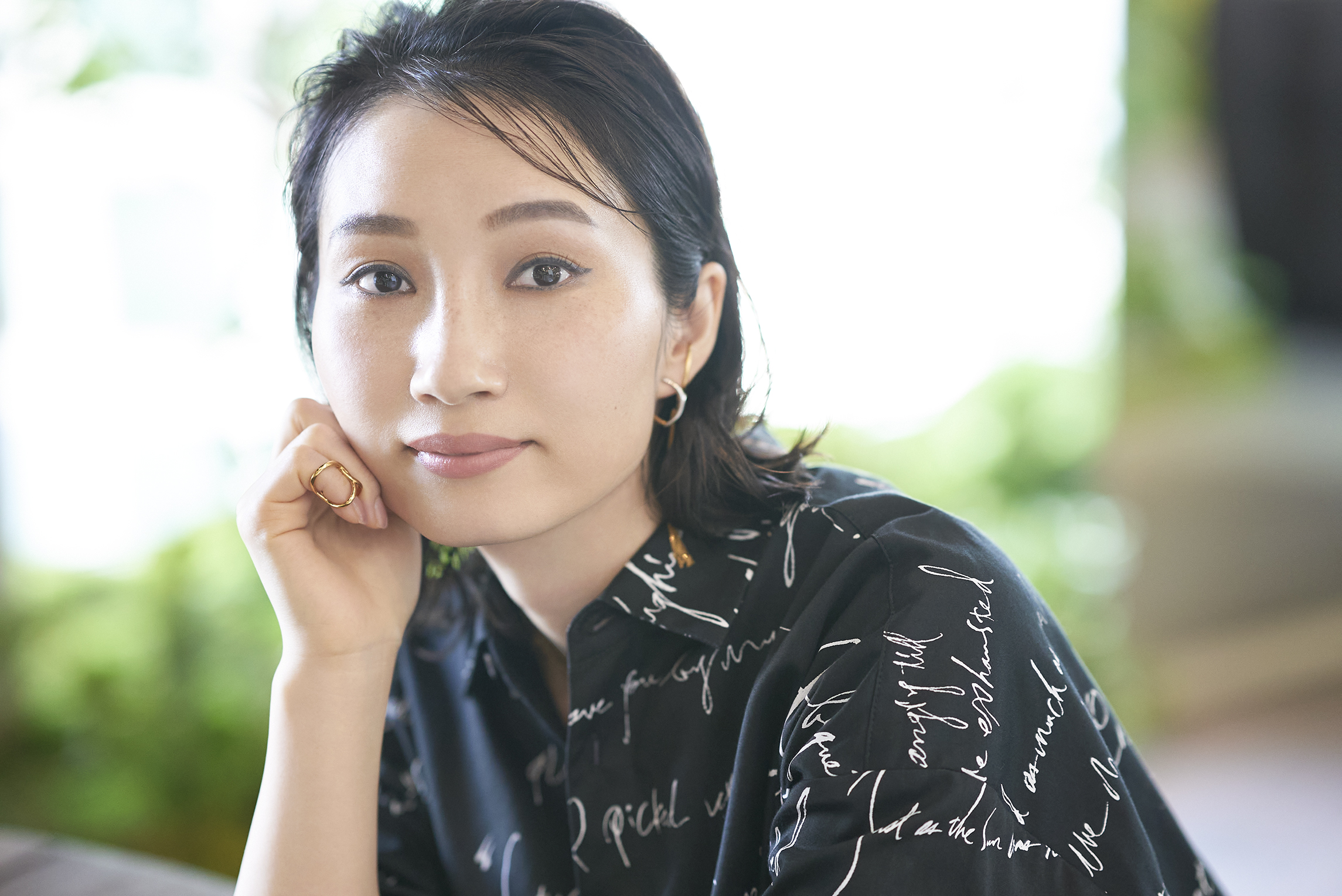 すっとした涼し気な目もとが魅力的なやすこさん。ふだんのメイクは、柔らかい印象になるよう心がけて、使用するカラーはピンクや暖色系が多いそう。「今日は、やすこさんの凛とした大人の雰囲気を生かしつ、全体の色みは抑え、カラーアイライナーで爽やかなスパイスを加えてみました」と、メイクを担当するSHISEIDO THE STORE ヘアメイクアップアーティスト 尾花純子さん。クラス感のある大人のモードメイクに挑戦です。