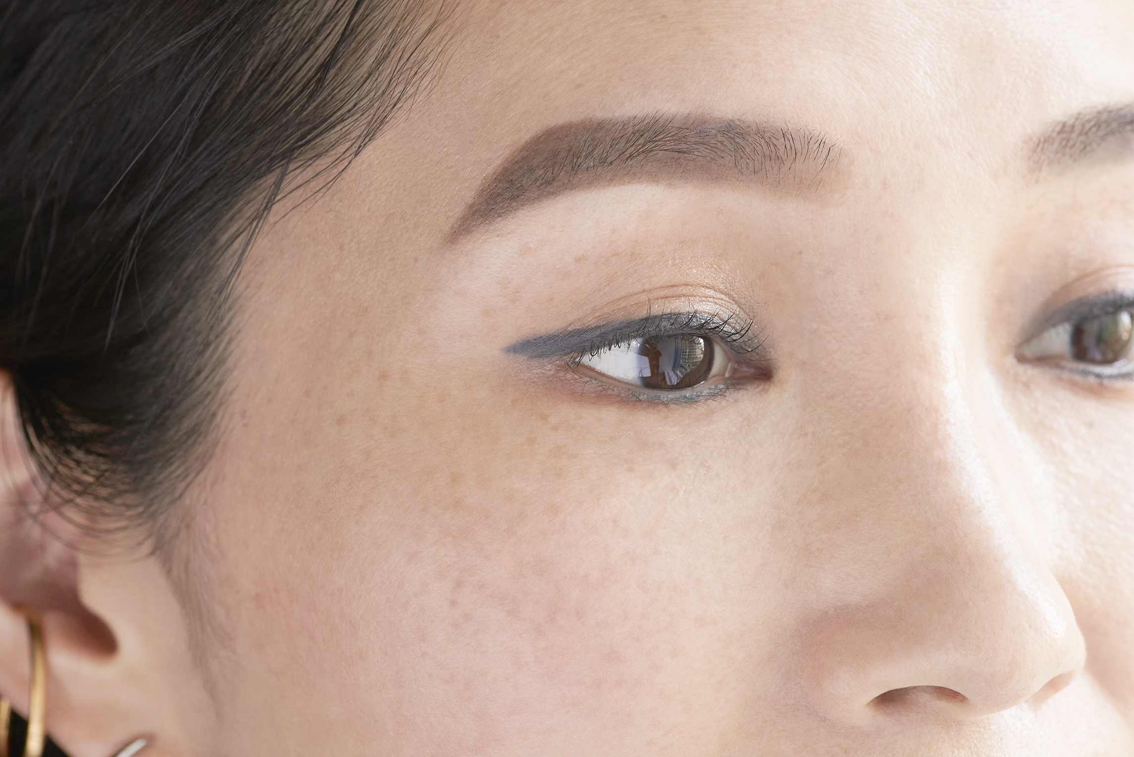 今回のメイクのポイントは“モード感”。ですが、“モード感”を全体で強調してしまうと、トゥーマッチな印象になってしまうので、眉については、自眉よりも少し太く直線的で短めに描き、ナチュラル&フレッシュに仕上げておきます。