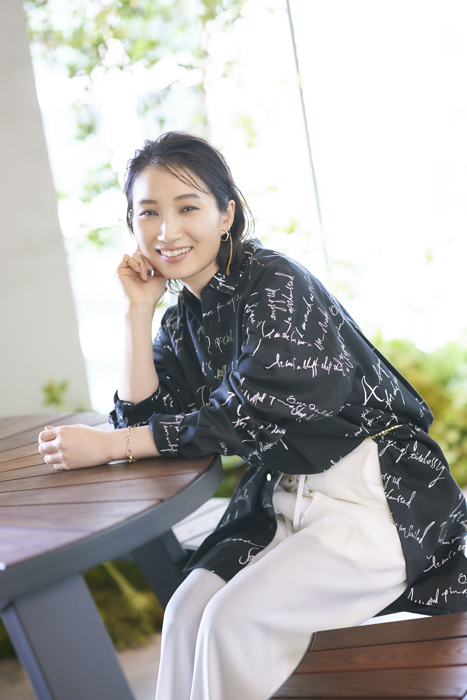ロングシャツ ¥34,100(税込)JUN OKAMOTO (JUN OKAMOTO DAIKANYAMA) 03-6455-3466、レースアップワイドパンツ ¥34,100(税込)ADELLY (Office surprise) 03-6228-6477、ステートメントネックレス ¥12,100(税込)、チョーカー ¥11,000(税込)、イヤーカフス ¥9,900(税込)、ウェアリングコーティング ¥16,500(税込)、サークルイヤリング ¥14,300(税込)、ブレスレット ¥11,000(税込)すべてJouete /0120-10-6616