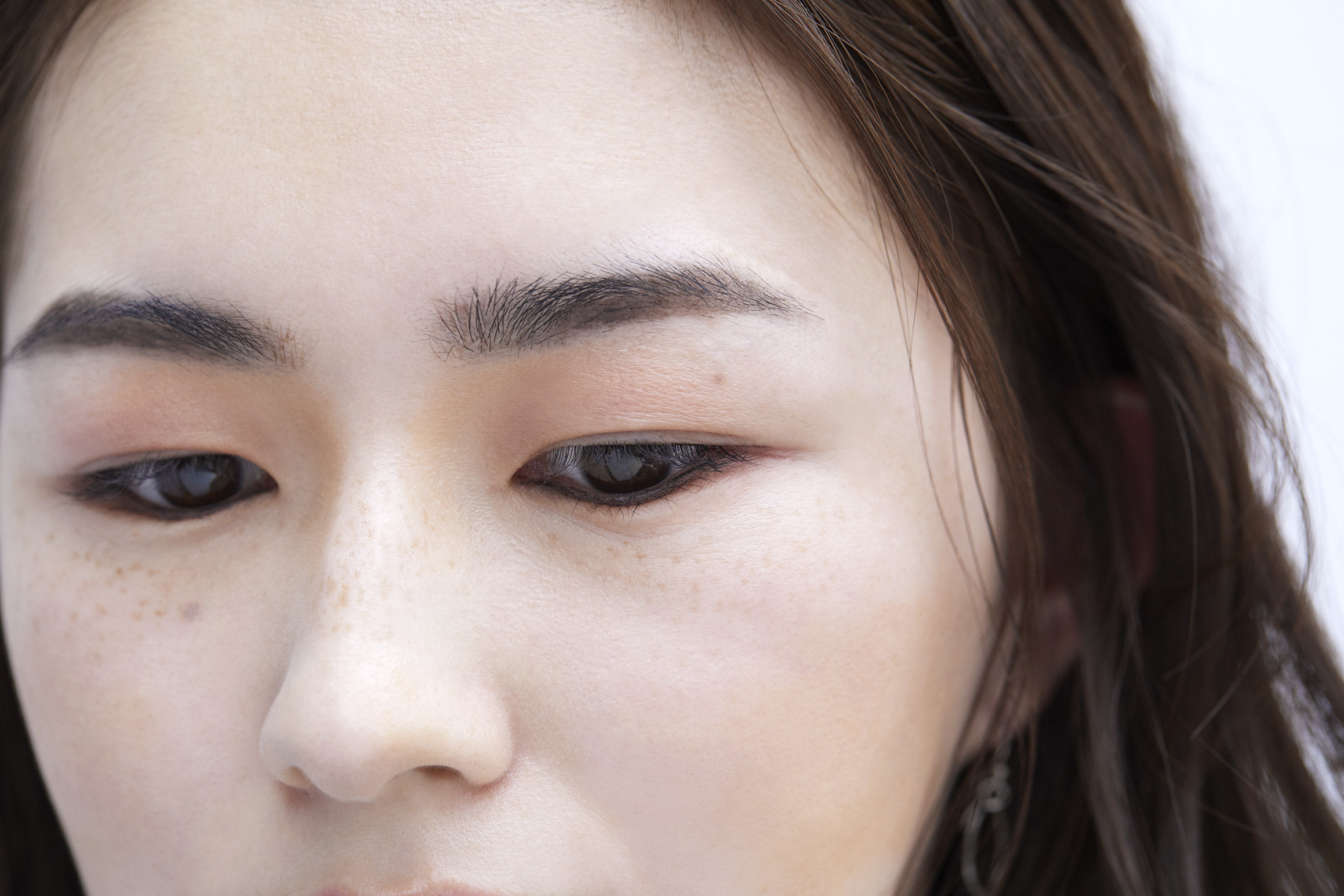 自眉が細いことにコンプレックスがあったという江美梨さん。「眉の毛束感で重くならず、これからは自眉を生かした太眉メイクができそう」と新しい自分に出会えたようす。