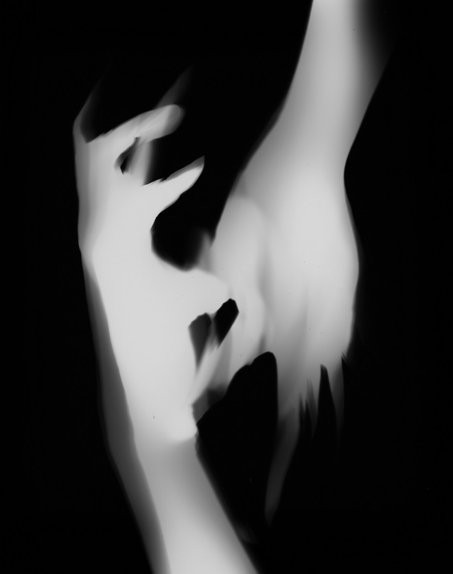 暗室でものそのものの影を印画紙に写しとるフォトグラムという技法は私たちにそのことを強く思い出させてくれる。印画紙の上に右手を置き、引き伸ばし機で光を数秒あてて現像液、停止液、定着液と印画紙を薬品にくぐらせると真っ白い印画紙の表面に徐々に画像が浮かび上がってくる。黒い背景の中に白い影として右手の形が現れて、定着される。右手の輪郭を光でなぞったような白黒反転したその影は、ディティールが詳細に記されたいわゆる普通の「写真」に比べると抽象的だけれど光に直接触れたという実在感がある。この目を瞑ってものに触れるようなリアリティはなんなのだろうかといつも考える。