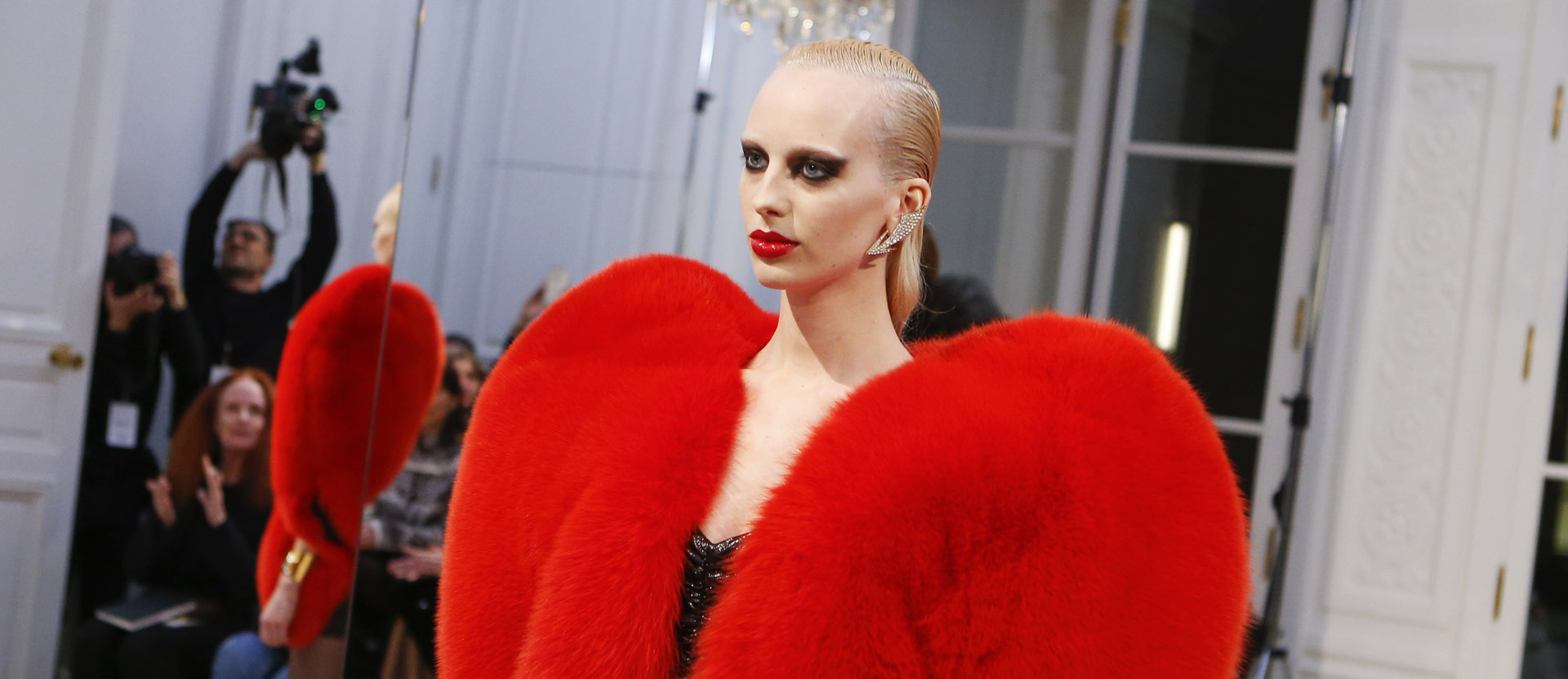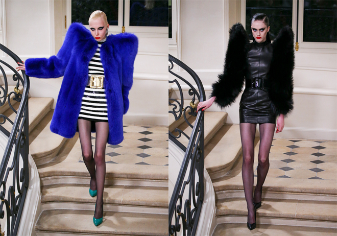 ド迫力のボリュームならば、エディ・スリマンの最後のコレクションとなったサンローランも見逃せない。モデルの頭と同じくらいの大きさの肩パッドが入っていそうなパワーショルダーが強烈な存在感を放った。大きな肩とは対照的にキュッと締まったウエスト、タイトスカートのボディコンシルエット、カラフル&メタリックな大胆配色は80年代を思わせる。