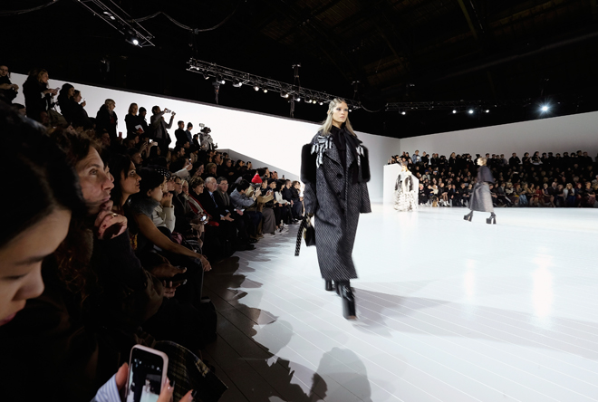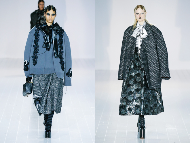 マーク ジェイコブスはオーバーサイズのジャケットにボリュームスカート、さらに超厚底靴を合わせて、重量感のあるスタイルを打ち出した。繊細な刺繍やびっしりと縫い付けられたパイエット、フェザーやファーなど過剰なディテールを調整するかのように、カラーパレットは白、黒、グレーのモノクローム。円形劇場のような丸いランウェイは一面ツヤツヤの真っ白に塗り上げられ、大きなドレスを纏ったモデルたちは、どこか人形劇のお人形のよう。