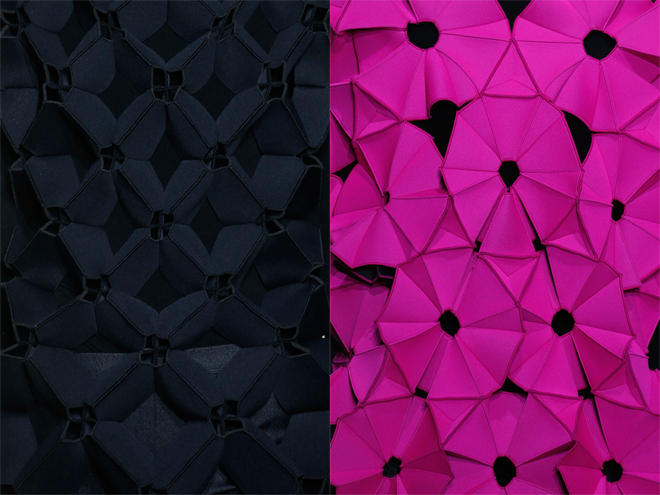 デザイナーである渡辺氏がこのコレクションに取り掛かる際は、布で図形を一つ一つ作るところから始めたという。布といっても、構築的な形を作りやすいように、車のシートに使われる素材などハリ感のある工業用テキスタイルを採用。ショー後の展示会の際に、間近でじっくりと見てみても、いったいこれらはどう形作られているのか、それがどのように繋がっているのか、どう縫製したのか、全くわからず圧倒されるばかり。