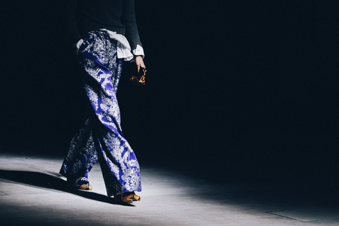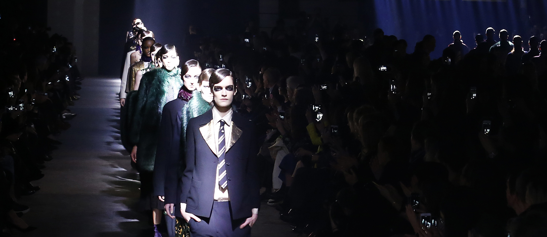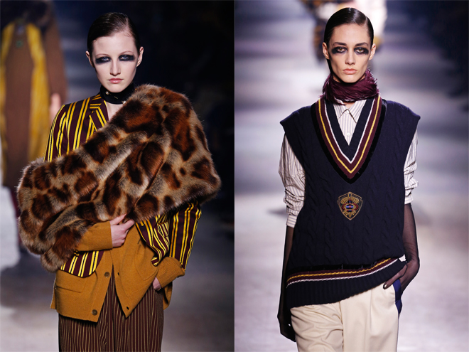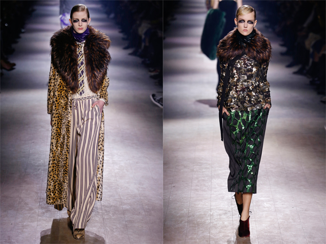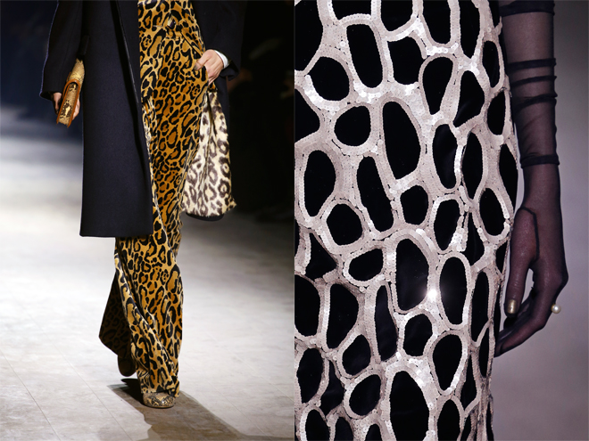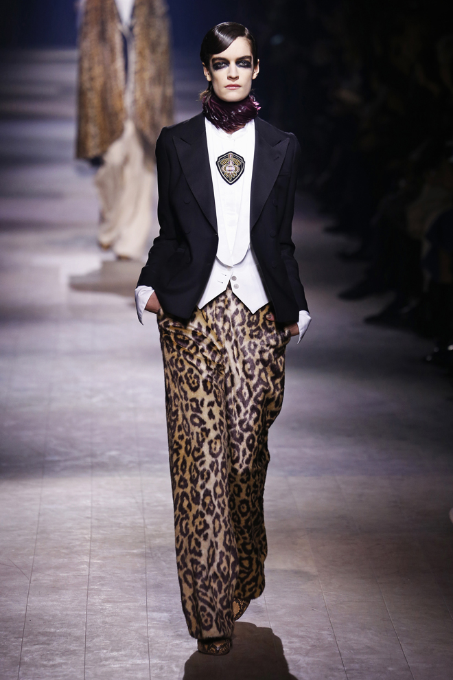今季のコレクションへの落とし込みも、夫人と愛人関係にあった詩人、ダヌンツィオのダンディな要素を持ち込んで、マスキュリンフェミニンなスタイルを基本とした。いつになく柄モノが多く、ファーやフェザー、ヒョウ柄、大量のパール使いなど夫人を思わせるギラついたモチーフを取り込みながら巧みに大人のエレガントスタイルへと昇華させた。
